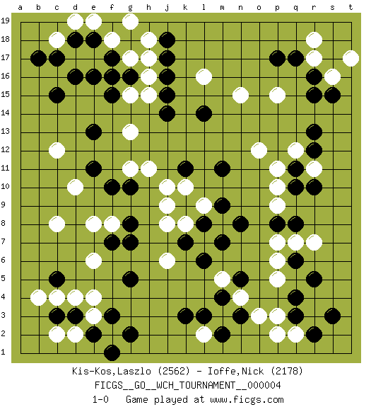 Last move : 1-0 2009 June 14 11:30:17 [Event "FICGS__GO__WCH_TOURNAMENT__000004"] [Site "FICGS"] [Date "2009.02.02"] [Round "1"] [Black "Kis-Kos,Laszlo"] [White "Ioffe,Nick"] [Result "1-0"] [Rating 1 "2562"] [Rating 2 "2178"] 1.r16 d17 2.q3 c4 3.p17 e3 4.c15 c12 5.f15 g17 6.d16 e17 7.c17 c18 8.b17 l16 9.r5 r11 10.k3 r7 11.r13 p7 12.c5 c8 13.c3 b4 14.d3 d4 15.e2 f2 16.f3 e4 17.g2 d2 18.f1 c2 19.j17 h15 20.j15 g15 21.f16 h17 22.j14 g13 23.e13 g11 24.e11 d10 25.f10 f8 26.g10 h11 27.f17 f18 28.g18 h18 29.e18 g19 30.d18 e19 31.e16 d19 32.l14 n15 33.k11 j10 34.m11 p15 35.j18 o12 36.g8 j8 37.f7 e8 38.g7 j6 39.k9 j9 40.g5 e6 41.l6 l7 42.k7 k8 43.l8 l9 44.m7 m8 45.m9 l7 46.g16 h16 47.l8 k10 48.n8 p5 49.j16 s16 50.r15 r17 51.q17 r18 52.s15 t17 53.q11 q12 54.r12 p11 55.q10 p10 56.r10 p9 57.q6 p6 58.q8 q7 59.p8 o3 60.n5 p3 61.q4 q2 62.r2 p2 63.s3 l2 64.l3 m3 65.m4 n4 66.m2 m5 67.n3 1-0 Here are the names of the openings (joseki) played in the four corners : Corner d16 : d17 c15 Komoku (Somok, Xiao~mu`) 3-4 Point. The komoku (3-4) point is the traditional corner enclosure move.. Ikken Kakari (Hankan Keolch'im, Yi Gua`jiao~, 1-Space Low Pincer). The small knight move is the basic approach move to the 3-4 point stone. It has been continually used for over four centuries. There are limitless variations, with new moves constantly being discovered. Black 2 opens the door to a treaure store of joseki. Player Black won this Go (weiqi, baduk) game. Follow this game move after move (download)When you study joseki, you lose two stones in strength. (Anonymous) It's unlucky to be superstitious. (Dave Enteles)