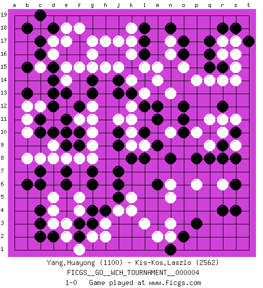 Last move : 1-0 2009 October 3 2:52:16 [Event "FICGS__GO__WCH_TOURNAMENT__000004"] [Site "FICGS"] [Date "2009.02.02"] [Round "1"] [Black "Yang,Huayong"] [White "Kis-Kos,Laszlo"] [Result "1-0"] [Rating 1 "1100"] [Rating 2 "2562"] 1.q16 d4 2.r4 d16 3.p3 r10 4.r8 r14 5.r12 p14 6.o17 q11 7.r15 s14 8.f3 h3 9.c3 d3 10.c4 d5 11.d2 e2 12.c2 e3 13.c6 l3 14.f17 k16 15.d14 e14 16.e13 e15 17.c17 d17 18.c16 c15 19.d15 c18 20.e16 e17 21.f16 g15 22.b18 f18 23.d18 e18 24.c19 g17 25.d13 r17 26.q17 s15 27.r18 r16 28.q15 q14 29.s18 c8 30.c7 d8 31.c10 b8 32.b6 r6 33.s10 s9 34.r9 s11 35.q10 r11 36.s8 p6 37.p8 p10 38.n8 n6 39.l8 n3 40.s4 c12 41.b13 b12 42.b15 d11 43.h4 j4 44.j5 k4 45.e6 f4 46.g4 f5 47.g3 h2 48.g6 g2 49.d10 f11 50.e11 b10 51.e9 e12 52.d12 e10 53.c11 b11 54.f12 e8 55.f9 f8 56.g7 g8 57.g14 f15 58.j7 g9 59.f10 g10 60.e11 g11 61.j14 d9 62.e10 q9 63.q8 g12 64.g13 k10 65.j9 k12 66.l14 n13 67.j10 j11 68.j16 j17 69.h16 h17 70.k15 g16 71.l16 k17 72.l17 m15 73.l18 k18 74.o2 l15 75.s6 n17 76.n18 n16 77.o16 o15 78.l10 h15 79.j13 j15 80.m11 k9 81.k8 s17 82.t17 s16 83.m6 n5 84.f2 f1 85.o11 n10 86.m12 k14 87.k13 l13 88.l12 m14 89.e7 k5 90.j6 n2 91.n1 m2 92.o10 l9 93.m9 k11 94.o12 1-0 Here are the names of the openings (joseki) played in the four corners : Corner q16 : q16 r14 Hoshi (Hwajeom, Seongjeom, Xingwei`) 4-4 Point. The star or hoshi (4-4) point, emphasizing influence at the potential expense of territory. Ikken Kakari (Hankan Keolch'im, Yi Gua`jiao~, 1-Space Low Approach). White 2 is the standard approach move to the 4-4. Corner d4 : d4 f3 Hoshi (Hwajeom, Seongjeom, Xingwei`) 4-4 Point. The star or hoshi (4-4) point, emphasizing influence at the potential expense of territory. Ikken Kakari (Hankan Keolch'im, Yi Gua`jiao~, 1-Space Low Approach). Black 2 is the standard approach move to the 4-4. Corner d16 : d16 f17 Hoshi (Hwajeom, Seongjeom, Xingwei`) 4-4 Point. The star or hoshi (4-4) point, emphasizing influence at the potential expense of territory. Ikken Kakari (Hankan Keolch'im, Yi Gua`jiao~, 1-Space Low Approach). Black 2 is the standard approach move to the 4-4. Player Black won this Go (weiqi, baduk) game. Follow this game move after move (download)If you lose by one point, take a rest. (Anonymous) The Internet is the world's largest library. It's just that all the books are on the floor. (John Allen Paulos)