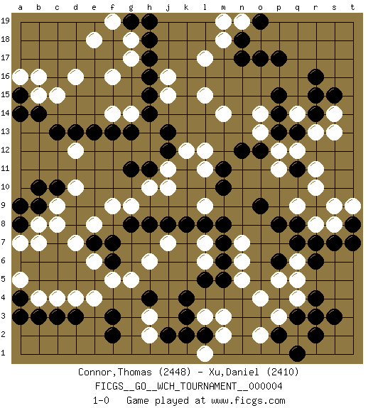 Last move : 1-0 2009 June 19 14:59:32 [Event "FICGS__GO__WCH_TOURNAMENT__000004"] [Site "FICGS"] [Date "2009.02.02"] [Round "1"] [Black "Connor,Thomas"] [White "Xu,Daniel"] [Result "1-0"] [Rating 1 "2448"] [Rating 2 "2410"] 1.r16 d4 2.q3 d16 3.p17 r10 4.r6 r13 5.f3 h3 6.c3 c4 7.d3 e4 8.f2 g5 9.c10 c8 10.c13 c15 11.e13 f16 12.h17 g17 13.h16 l17 14.n17 l15 15.h14 f14 16.f13 g14 17.g13 j15 18.h15 g18 19.j12 e8 20.k3 r3 21.r4 q2 22.s3 p3 23.r2 q4 24.r3 l3 25.l2 m3 26.k4 m2 27.j2 h2 28.l5 n5 29.m6 n6 30.m8 n7 31.k8 h6 32.h18 m14 33.q11 r11 34.q13 q14 35.r14 q12 36.p13 s14 37.r15 p12 38.o12 o13 39.p14 o14 40.p15 p11 41.n12 l12 42.m11 l11 43.m10 j11 44.h11 j10 45.h8 h10 46.g11 k12 47.j13 g9 48.g8 f9 49.o9 q5 50.p2 o2 51.q1 q6 52.r7 j7 53.j8 l7 54.m7 l9 55.l8 l6 56.m5 o4 57.p8 q9 58.q8 b4 59.b3 s13 60.b14 b15 61.b9 b8 62.a15 a16 63.a14 b16 64.g19 f19 65.h19 e18 66.a4 a5 67.a3 m18 68.n18 n19 69.o19 m19 70.o17 s8 71.s7 r8 72.q7 c9 73.b10 d12 74.d13 d10 75.f7 e6 76.t8 t9 77.t7 s9 78.a8 a7 79.a9 b7 80.s15 l1 81.k2 j16 82.f6 f5 83.e7 d7 84.p6 p5 85.h4 1-0 Here are the names of the openings (joseki) played in the four corners : Corner d4 : d4 f3 Hoshi (Hwajeom, Seongjeom, Xingwei`) 4-4 Point. The star or hoshi (4-4) point, emphasizing influence at the potential expense of territory. Ikken Kakari (Hankan Keolch'im, Yi Gua`jiao~, 1-Space Low Approach). Black 2 is the standard approach move to the 4-4. Corner d16 : d16 c13 Hoshi (Hwajeom, Seongjeom, Xingwei`) 4-4 Point. The star or hoshi (4-4) point, emphasizing influence at the potential expense of territory. Nikken Kakari (Dukan Keolch'im, E`r Gua`jiao~, 2-Space Low Approach). White typically answers by 7-3 or 3-5 (which is not joseki). Player Black won this Go (weiqi, baduk) game. Follow this game move after move (download)Go is essentially a form of harmony. Go in the 21st century will have to be go of the 'harmony of the six points - the four quarters, the above and the below.' As in life we will need to view the whole rather than the part. Japanese go has focused too heavily on the local (joseki) rather than the whole for 300 years. The reason the Chinese and Koreans are overtaking the Japanese is that they are closer to achieve this whole-board view. (Go Seigen, 9p, 1994) Never risk one's whole fortune unless supported by one's entire army. (Niccolo Machiavelli)