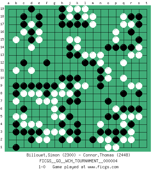 Last move : 1-0 2009 May 25 23:33:43 [Event "FICGS__GO__WCH_TOURNAMENT__000004"] [Site "FICGS"] [Date "2009.02.02"] [Round "1"] [Black "Billouet,Simon"] [White "Connor,Thomas"] [Result "1-0"] [Rating 1 "2300"] [Rating 2 "2448"] 1.r16 d4 2.q3 d17 3.d15 e15 4.c17 d14 5.d16 e16 6.e17 d18 7.c18 b15 8.e18 c16 9.d19 d17 10.h17 q5 11.q8 n4 12.p5 p6 13.o5 r3 14.o3 q2 15.r4 q4 16.p3 r2 17.q6 r5 18.r6 p16 19.q14 r17 20.s17 q17 21.s15 m17 22.k4 g3 23.c6 c8 24.c3 c4 25.d3 e4 26.e3 f3 27.b4 b5 28.b3 c5 29.d9 d8 30.f9 e8 31.e9 g8 32.f8 f7 33.g9 h8 34.j10 q12 35.o14 q10 36.o7 o11 37.s6 s5 38.k17 l18 39.k3 d11 40.c9 h9 41.h10 k9 42.k10 l9 43.b8 b7 44.b9 b11 45.j9 j8 46.k8 e7 47.n10 r13 48.n11 r9 49.k7 n12 50.m12 n13 51.r18 q18 52.s18 o10 53.n9 j18 54.k18 k19 55.h18 e2 56.d2 f2 57.b1 j2 58.k2 o1 59.h6 n2 60.n3 g6 61.j7 g7 62.m2 s14 63.r14 s13 64.s8 s9 65.f12 m13 66.l12 h5 67.j5 p15 68.p14 l13 69.k13 k14 70.j14 j15 71.j13 k15 72.j17 j19 73.h19 l19 74.l17 m18 75.h4 g5 76.h2 h3 77.j3 o2 78.p2 p1 79.c12 1-0 Here are the names of the openings (joseki) played in the four corners : Corner d16 : d17 d15 Komoku (Somok, Xiao~mu`) 3-4 Point. The komoku (3-4) point is the traditional corner enclosure move.. Ikken Takagakari (Hankan Nop'dakeolch'im, Yi Gaogua`jiao~, 1-Space High Approach). The 5-4 approach move has become more popular in modern times, as modern Go emphasizes speed and influence. Corner q4 : q3 q5 Komoku (Somok, Xiao~mu`) 3-4 Point. The komoku (3-4) point is the traditional corner enclosure move.. Ikken Takagakari (Hankan Nop'dakeolch'im, Yi Gaogua`jiao~, 1-Space High Approach). The 5-4 approach move has become more popular in modern times, as modern Go emphasizes speed and influence. Corner q16 : r16 p16 Komoku (Somok, Xiao~mu`) 3-4 Point. The komoku (3-4) point is the traditional corner enclosure move.. Ikken Takagakari (Hankan Nop'dakeolch'im, Yi Gaogua`jiao~, 1-Space High Approach). The 5-4 approach move has become more popular in modern times, as modern Go emphasizes speed and influence. Player Black won this Go (weiqi, baduk) game. Follow this game move after move (download)Pon-nuki is worth thirty points. (Anonymous) Creativity is inventing, experimenting, growing, taking risks, breaking rules, making mistakes, and having fun. (Mary Lou Cook)