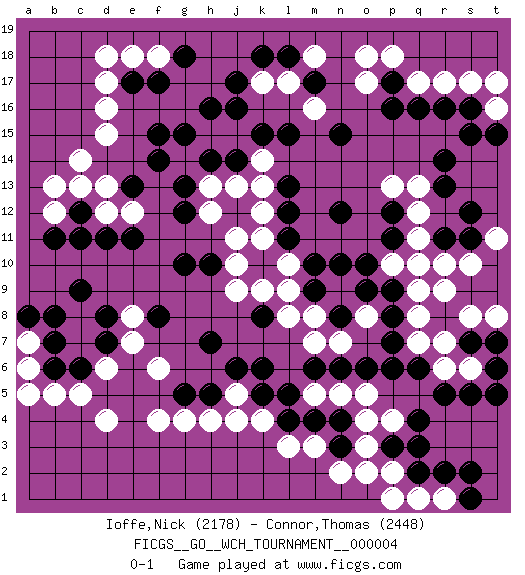 Last move : 0-1 2009 September 5 22:13:48 [Event "FICGS__GO__WCH_TOURNAMENT__000004"] [Site "FICGS"] [Date "2009.02.02"] [Round "1"] [Black "Ioffe,Nick"] [White "Connor,Thomas"] [Result "0-1"] [Rating 1 "2178"] [Rating 2 "2448"] 1.q16 d4 2.q4 d16 3.q10 o17 4.m17 r17 5.r16 q17 6.p16 o18 7.n15 k4 8.f17 c14 9.f15 o3 10.p3 o4 11.q6 f4 12.c9 c5 13.c12 d18 14.c6 d6 15.b6 q8 16.o6 r10 17.r11 r9 18.s11 r6 19.r5 o8 20.m6 n5 21.n6 m8 22.k6 j5 23.n10 l9 24.l11 j9 25.h7 s6 26.s5 q7 27.p6 k17 28.s7 r7 29.t6 s8 30.t7 k11 31.l12 j11 32.g10 j13 33.k15 j15 34.j16 k14 35.l15 h15 36.h16 m18 37.l18 l17 38.k18 m16 39.j17 b5 40.d7 b13 41.g13 p10 42.p11 q9 43.o10 q11 44.p9 q10 45.n8 h13 46.g12 n9 47.o9 n7 48.p8 t8 49.t5 s10 50.p7 g14 51.f14 l10 52.k8 k9 53.g15 k12 54.l13 k13 55.p12 q12 56.r13 q13 57.r14 p2 58.q2 o2 59.l4 l3 60.m4 m3 61.n4 b12 62.b11 e7 63.d8 a6 64.b7 a7 65.a8 a5 66.b8 f6 67.h5 h4 68.g5 g4 69.j6 s17 70.s16 t16 71.t15 t17 72.s15 f18 73.g18 e18 74.h10 j10 75.h14 h12 76.j14 q1 77.r2 r1 78.s1 p1 79.n3 n2 80.k5 j4 81.s2 t11 82.s12 d12 83.d11 c13 84.c11 e12 85.e11 d15 86.p17 p18 87.e17 d17 88.m10 p13 89.n12 p4 90.q3 m5 91.l5 o5 92.m9 l8 93.n8 m7 94.e13 d13 95.f8 e8 0-1 This go game has been lost on time (started : 2009.02.02 0:8:52) Here are the names of the openings (joseki) played in the four corners : Corner q16 : q16 o17 Hoshi (Hwajeom, Seongjeom, Xingwei`) 4-4 Point. The star or hoshi (4-4) point, emphasizing influence at the potential expense of territory. Ikken Kakari (Hankan Keolch'im, Yi Gua`jiao~, 1-Space Low Approach). White 2 is the standard approach move to the 4-4. Corner d16 : d16 f17 Hoshi (Hwajeom, Seongjeom, Xingwei`) 4-4 Point. The star or hoshi (4-4) point, emphasizing influence at the potential expense of territory. Ikken Kakari (Hankan Keolch'im, Yi Gua`jiao~, 1-Space Low Approach). Black 2 is the standard approach move to the 4-4. Corner q4 : q4 o3 Hoshi (Hwajeom, Seongjeom, Xingwei`) 4-4 Point. The star or hoshi (4-4) point, emphasizing influence at the potential expense of territory. Ikken Kakari (Hankan Keolch'im, Yi Gua`jiao~, 1-Space Low Approach). White 2 is the standard approach move to the 4-4. Player White won this Go (weiqi, baduk) game. Follow this game move after move (download)Big groups never die. (Anonymous) Internal peace cannot coexist with external war. (Don Groves)