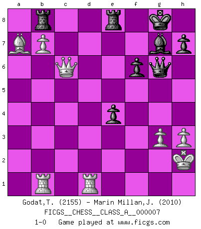 Last move : 1-0 2006 December 20 23:9:33 [Event "FICGS__CHESS__CLASS_A__000007"] [Site "FICGS"] [Date "2006.08.27"] [Round "1"] [White "Godat,Terry"] [Black "Marin Millan,Jose Antonio"] [Result "1-0"] [WhiteElo "2155"] [BlackElo "2010"] 1.Nf3 Nf6 2.g3 g6 3.c4 Bg7 4.Bg2 O-O 5.d4 d6 6.O-O Nbd7 7.Nc3 e5 8.e4 c6 9.b3 Qc7 10.h3 exd4 11.Nxd4 Re8 12.Re1 Nc5 13.Bf4 Nfd7 14.Qd2 Ne5 15.Red1 Ned3 16.Be3 a5 17.Rab1 f6 18.a3 Ne5 19.f4 Nf7 20.Kh2 Qe7 21.Bf2 Qc7 22.Qc2 Qe7 23.b4 axb4 24.axb4 Ne6 25.Na4 Nxd4 26.Bxd4 Be6 27.Nb6 Rab8 28.f5 Bc8 29.c5 Qc7 30.cxd6 Nxd6 31.b5 gxf5 32.Nd5 Qf7 33.bxc6 Be6 34.Nf4 Nxe4 35.Nxe6 Qxe6 36.cxb7 Qf7 37.Qc6 Qg6 38.Bxe4 fxe4 39.Ba7 1-0 Reti : King's Indian attack Kingside Castling by player Black (move 4) Kingside Castling by player White (move 6) Player White won this chess game. Follow this game move after move (download)Chess mastery essentially consists of analyzing Chess positions accurately. (Mikhail Botvinnik) Er war ein guter Schachspieler, aber ich kann Leute nicht ausstehen, die 'Heil Hitler' rufen (Über Alexander Aljechin). (Miguel Najdorf) El Ajedrez es 99 por ciento táctica. (Teichmann) Karpov est une pièce de musée. (Garry Kasparov) A good player is always lucky. (Capablanca)