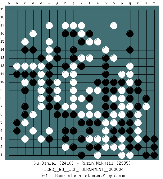 Last move : 0-1 2009 March 24 12:42:13 [Event "FICGS__GO__WCH_TOURNAMENT__000004"] [Site "FICGS"] [Date "2009.02.02"] [Round "1"] [Black "Xu,Daniel"] [White "Ruzin,Mikhail"] [Result "0-1"] [Rating 1 "2410"] [Rating 2 "2395"] 1.q16 d4 2.q3 d16 3.q9 n4 4.q5 k4 5.c6 f4 6.b4 c3 7.c9 k16 8.c14 c15 9.d14 f17 10.d11 o17 11.q14 e7 12.g6 d6 13.c7 e9 14.j4 j3 15.k3 l3 16.h3 k2 17.h4 k6 18.j6 j7 19.h6 c5 20.b5 h7 21.g7 g8 22.f8 e8 23.h8 g9 24.k7 j8 25.k5 l6 26.l5 m6 27.m5 n5 28.h9 j9 29.h10 j10 30.f9 g10 31.f10 h11 32.f7 e10 33.f11 e11 34.f12 e12 35.g13 f13 36.e13 f14 37.g14 f15 38.h12 j12 39.j13 k13 40.k12 j11 41.j14 l13 42.j16 j17 43.h16 h17 44.k15 l15 45.f3 e3 46.j2 h2 47.k3 c10 48.d10 j3 49.l16 k17 50.k3 m15 51.l4 d12 52.c11 c12 53.b11 b12 54.n6 o6 55.n7 l7 56.o7 p6 57.r7 p7 58.o9 o8 59.n8 p8 60.l8 k8 61.n10 p9 62.p10 p3 63.p5 o5 64.q2 p2 65.m2 m3 66.l2 n2 67.o3 q10 68.r9 p11 69.o10 m9 70.n9 q12 71.m10 l9 72.n12 o13 73.n13 n14 74.n11 n3 75.p4 m1 76.k1 o2 77.o4 r6 78.q6 q7 79.q8 r5 80.q4 r4 81.s3 s7 82.r10 q11 83.s8 r3 84.r2 s2 85.s1 t2 86.t3 q1 87.t1 s2 88.t2 p1 0-1 Here are the names of the openings (joseki) played in the four corners : Corner d4 : d4 c6 Hoshi (Hwajeom, Seongjeom, Xingwei`) 4-4 Point. The star or hoshi (4-4) point, emphasizing influence at the potential expense of territory. Ikken Kakari (Hankan Keolch'im, Yi Gua`jiao~, 1-Space Low Approach). Black 2 is the standard approach move to the 4-4. Corner d16 : d16 c14 Hoshi (Hwajeom, Seongjeom, Xingwei`) 4-4 Point. The star or hoshi (4-4) point, emphasizing influence at the potential expense of territory. Ikken Kakari (Hankan Keolch'im, Yi Gua`jiao~, 1-Space Low Approach). Black 2 is the standard approach move to the 4-4. Corner q16 : q16 o17 Hoshi (Hwajeom, Seongjeom, Xingwei`) 4-4 Point. The star or hoshi (4-4) point, emphasizing influence at the potential expense of territory. Ikken Kakari (Hankan Keolch'im, Yi Gua`jiao~, 1-Space Low Approach). White 2 is the standard approach move to the 4-4. Player White won this Go (weiqi, baduk) game. Follow this game move after move (download)When your opponent is thick, you must also become thick. (Otake Hideo, 9p) Games, world of games... There's always an opponent, and there's always a victim. (Revolver, movie)