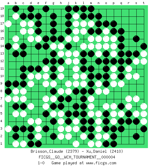Last move : 1-0 2009 May 17 12:59:7 [Event "FICGS__GO__WCH_TOURNAMENT__000004"] [Site "FICGS"] [Date "2009.02.02"] [Round "1"] [Black "Brisson,Claude"] [White "Xu,Daniel"] [Result "1-0"] [Rating 1 "2379"] [Rating 2 "2410"] 1.q16 d4 2.r4 d16 3.f3 k3 4.c6 d6 5.c3 c5 6.d3 c7 7.b6 b5 8.o3 r10 9.r13 r7 10.q6 n3 11.o4 o2 12.p2 n2 13.c10 b7 14.c14 c16 15.e11 h17 16.p17 l17 17.l5 h3 18.g2 h2 19.f5 s5 20.s6 r6 21.r5 s7 22.s4 t6 23.n17 f7 24.e14 f16 25.j5 h5 26.h6 g5 27.g6 f6 28.g4 h4 29.b3 m5 30.l6 m6 31.l7 m7 32.l8 h8 33.l4 n4 34.l3 l2 35.q3 l10 36.m8 n8 37.m10 n9 38.m9 b14 39.b13 b15 40.c13 h10 41.l11 k10 42.n10 p9 43.q11 r11 44.q12 m12 45.l12 m14 46.l13 l14 47.m13 n14 48.l18 k18 49.m18 g14 50.j17 k17 51.j16 k15 52.j14 j15 53.g8 g7 54.h7 j6 55.j7 j8 56.k6 f9 57.e17 f17 58.e16 e15 59.f15 d15 60.g15 h16 61.h15 h14 62.f14 j13 63.g13 h13 64.g12 s12 65.s13 t13 66.t14 t12 67.s15 o6 68.e18 f18 69.c18 c17 70.j18 h18 71.k19 p14 72.j11 k13 73.m16 k16 74.j19 l19 75.m19 h19 76.l19 m17 77.n18 m15 78.d18 b18 79.b19 c19 80.d19 a17 81.f19 g19 82.g16 e19 83.g17 d17 84.f19 e2 85.g18 e3 86.a14 p5 87.s2 q5 88.n16 l16 89.d2 b1 90.q10 q9 91.o13 o14 92.j10 k9 93.k8 j9 94.g10 g9 95.b9 n13 96.o12 k11 97.n12 k12 98.m11 f10 99.g11 f11 100.f12 e10 101.d11 h11 102.o5 n5 103.q4 p6 104.q14 p13 105.p12 p15 106.q15 d9 107.k2 j2 108.m2 k1 109.m3 p4 110.p3 m1 111.r12 s10 112.b2 c1 113.e1 e4 114.o10 p10 115.o9 o8 116.d1 a3 117.j4 j3 118.h12 j12 119.c9 c8 120.a8 a7 121.p16 b8 122.a9 d10 123.c11 k4 124.k5 t4 125.t3 t5 126.o1 n1 127.p1 p11 128.o11 o16 129.o17 o15 130.q13 n15 131.m4 l9 132.pass pass 133.pass pass 134.pass 1-0 Here are the names of the openings (joseki) played in the four corners : Corner d4 : d4 f3 Hoshi (Hwajeom, Seongjeom, Xingwei`) 4-4 Point. The star or hoshi (4-4) point, emphasizing influence at the potential expense of territory. Ikken Kakari (Hankan Keolch'im, Yi Gua`jiao~, 1-Space Low Approach). Black 2 is the standard approach move to the 4-4. Corner d16 : d16 c14 Hoshi (Hwajeom, Seongjeom, Xingwei`) 4-4 Point. The star or hoshi (4-4) point, emphasizing influence at the potential expense of territory. Ikken Kakari (Hankan Keolch'im, Yi Gua`jiao~, 1-Space Low Approach). Black 2 is the standard approach move to the 4-4. Player Black won this Go (weiqi, baduk) game. Follow this game move after move (download)With only one group, you will win. (Anonymous) Everybody lies. (Gregory House, House M.D.)