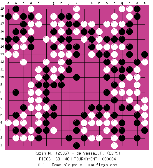 Last move : 0-1 2009 June 15 15:24:15 [Event "FICGS__GO__WCH_TOURNAMENT__000004"] [Site "FICGS"] [Date "2009.02.02"] [Round "1"] [Black "Ruzin,Mikhail"] [White "de Vassal,Thibault"] [Result "0-1"] [Rating 1 "2395"] [Rating 2 "2279"] 1.q16 d17 2.q4 d3 3.d5 d8 4.g5 g3 5.d14 c12 6.c17 d16 7.c16 c15 8.d15 c14 9.d18 e18 10.c18 e17 11.b15 b14 12.b16 b18 13.b19 d19 14.a18 h17 15.q10 e11 16.k4 k16 17.k10 h11 18.j11 h12 19.h10 g10 20.g9 o3 21.p3 o4 22.q6 k2 23.j2 l3 24.k3 l4 25.l2 m2 26.k1 p2 27.q2 n2 28.c3 c4 29.d4 c2 30.b3 b2 31.e3 d2 32.e2 c5 33.c6 b4 34.l5 p4 35.q3 m5 36.m6 m4 37.n6 p1 38.f10 g11 39.j12 h13 40.k14 r12 41.q12 r10 42.r11 s11 43.q11 s9 44.r9 s10 45.r13 r8 46.s12 q9 47.p9 r7 48.r6 p8 49.o8 n16 50.j15 g15 51.l16 l17 52.k17 l15 53.m16 m17 54.m15 n15 55.m14 o17 56.j16 q17 57.r17 p16 58.q18 p17 59.q15 o14 60.o13 p18 61.g16 h16 62.g14 h14 63.h15 f15 64.b5 a4 65.b8 d6 66.e6 d7 67.f9 e4 68.f4 e5 69.f3 f6 70.g6 e10 71.f11 f12 72.h18 k18 73.j17 g17 74.j18 r18 75.s18 r19 76.s19 q19 77.r16 g18 78.s7 s8 79.p7 s6 80.s5 t7 81.a14 b13 82.f7 t5 83.s4 p13 84.o12 q14 85.r14 p12 86.p11 n14 87.n13 t4 88.t3 t6 89.s2 j13 90.k13 k19 91.n5 n4 92.p15 p14 93.e9 d9 94.p5 o5 95.o6 e7 96.f8 a13 97.a15 q8 98.f5 e6 99.j14 g13 100.o15 e8 101.h9 t12 102.t13 o11 103.o10 m13 0-1 Comment by player 2 : Thibault de Vassal : Hello Mikhail, thanks for the game.. I'm really sorry to win that way as obviously I was losing after your great manoeuvres in the center... It seems that every player must lose some games at the very end and that is Go. Best of luck in your other games ! Here are the names of the openings (joseki) played in the four corners : Corner d4 : d3 d5 Komoku (Somok, Xiao~mu`) 3-4 Point. The komoku (3-4) point is the traditional corner enclosure move.. Ikken Takagakari (Hankan Nop'dakeolch'im, Yi Gaogua`jiao~, 1-Space High Approach). The 5-4 approach move has become more popular in modern times, as modern Go emphasizes speed and influence. Corner d16 : d17 d14 Komoku (Somok, Xiao~mu`) 3-4 Point. The komoku (3-4) point is the traditional corner enclosure move.. Nikken Takagakari (Dukan Nop'dakeolch'im, E`r Gaojia, 2-Space High Approch). The great master Honinbo Shuei (1852-1906) favored the two-space high (niken taka-gakari) approach, especially in two stone handicap games. This approach move was very popular in the 1910s. Wu Qingyuan = Go Seigen frequently played this way, considering it a good "whole board" approach. In recent years, O Rissei has often used the two-space high approach. Corner q4 : q4 o3 Hoshi (Hwajeom, Seongjeom, Xingwei`) 4-4 Point. The star or hoshi (4-4) point, emphasizing influence at the potential expense of territory. Ikken Kakari (Hankan Keolch'im, Yi Gua`jiao~, 1-Space Low Approach). White 2 is the standard approach move to the 4-4. Corner q16 : q16 r12 Hoshi (Hwajeom, Seongjeom, Xingwei`) 4-4 Point. The star or hoshi (4-4) point, emphasizing influence at the potential expense of territory. Player White won this Go (weiqi, baduk) game. Follow this game move after move (download)Conservative and slow will win. Believe it ! (Anonymous) Think like a man of action, act like a man of thought. (Henri Louis Bergson)