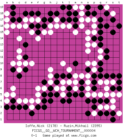 Last move : 0-1 2009 May 10 13:27:39 [Event "FICGS__GO__WCH_TOURNAMENT__000004"] [Site "FICGS"] [Date "2009.02.02"] [Round "1"] [Black "Ioffe,Nick"] [White "Ruzin,Mikhail"] [Result "0-1"] [Rating 1 "2178"] [Rating 2 "2395"] 1.q16 d4 2.q4 d17 3.q10 o17 4.m17 o15 5.q14 l16 6.l17 k16 7.k17 j16 8.h17 h16 9.g17 j17 10.j18 e15 11.k4 d10 12.f3 f5 13.c3 c4 14.d3 e4 15.g3 k6 16.m5 m7 17.m10 k10 18.h6 h5 19.j5 j6 20.g5 g6 21.h4 h7 22.g7 f6 23.j7 h8 24.k8 l9 25.l8 m8 26.h5 m6 27.j8 h9 28.d13 c14 29.c10 c11 30.d11 c12 31.d9 e10 32.c8 b10 33.b9 c9 34.l6 l7 35.c10 k18 36.h18 c9 37.l5 k7 38.c10 e3 39.e2 c9 40.d18 c10 41.c17 e17 42.e18 c16 43.b17 b16 44.p18 r17 45.r16 s16 46.s15 q18 47.q17 s18 48.q19 r19 49.t16 p19 50.s17 p17 51.r18 o10 52.q19 o12 53.o19 q7 54.r8 r7 55.s8 q12 56.r12 q11 57.r11 o5 58.o4 r3 59.r4 q3 60.p3 p2 61.o2 s4 62.s2 s3 63.r2 r5 64.q2 q5 65.p4 p5 66.n5 n16 67.b4 b5 68.b3 b6 69.q13 o13 70.o9 p10 71.q9 p9 72.p8 o7 73.q8 o8 74.g16 g15 75.m16 m15 76.f15 h15 77.e16 d16 78.f16 f14 79.a16 a15 80.s6 s5 81.p7 s7 82.t7 n18 83.m18 a17 84.b18 m19 85.l19 n19 86.k19 t2 87.s1 p13 88.n6 o6 89.n7 n8 90.o18 n17 91.l18 f17 92.f18 r6 93.t6 t5 94.t8 a18 95.b19 p15 96.q15 p16 97.p14 o14 98.p6 f4 99.g4 k5 100.l4 a4 101.a3 a5 102.pass a16 0-1 Here are the names of the openings (joseki) played in the four corners : Corner q16 : q16 o17 Hoshi (Hwajeom, Seongjeom, Xingwei`) 4-4 Point. The star or hoshi (4-4) point, emphasizing influence at the potential expense of territory. Ikken Kakari (Hankan Keolch'im, Yi Gua`jiao~, 1-Space Low Approach). White 2 is the standard approach move to the 4-4. Corner d4 : d4 f3 Hoshi (Hwajeom, Seongjeom, Xingwei`) 4-4 Point. The star or hoshi (4-4) point, emphasizing influence at the potential expense of territory. Ikken Kakari (Hankan Keolch'im, Yi Gua`jiao~, 1-Space Low Approach). Black 2 is the standard approach move to the 4-4. Player White won this Go (weiqi, baduk) game. Follow this game move after move (download)The weak player fears ko, the strong player seeks it. (Bill Taylor) As the days dwindle down... to a precious few. (Maxwell Anderson)