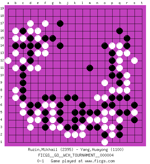 Last move : 0-1 2009 July 6 15:49:49 [Event "FICGS__GO__WCH_TOURNAMENT__000004"] [Site "FICGS"] [Date "2009.02.02"] [Round "1"] [Black "Ruzin,Mikhail"] [White "Yang,Huayong"] [Result "0-1"] [Rating 1 "2395"] [Rating 2 "1100"] 1.q16 d4 2.q3 d16 3.q9 n4 4.l4 p5 5.r5 n7 6.f3 c6 7.f5 r6 8.q5 q6 9.p4 o5 10.p7 s5 11.s4 o7 12.p6 p8 13.q7 q8 14.r7 r8 15.s6 j4 16.k5 j5 17.k7 j6 18.j7 l3 19.m3 k6 20.l6 m4 21.n3 o3 22.o2 p2 23.o4 p3 24.k3 l2 25.n5 q4 26.m5 o4 27.k4 j2 28.j3 h3 29.h4 k2 30.l5 g4 31.h5 g3 32.f4 d3 33.o6 g5 34.h6 f6 35.d5 e5 36.e6 e4 37.f7 g6 38.d6 c5 39.g7 q11 40.p10 r9 41.q2 o1 42.p11 q12 43.q10 r10 44.r14 o9 45.p12 s12 46.m11 q13 47.p13 q14 48.r15 p14 49.o14 r13 50.c7 b7 51.c8 b8 52.c9 f17 53.c16 c15 54.d15 d17 55.c14 b15 56.b14 e15 57.d14 f14 58.h17 b16 59.h14 e13 60.e14 f13 61.f15 e16 62.g15 c12 63.b12 b11 64.c11 d11 65.c10 b13 66.d12 a12 67.d13 e11 0-1 Here are the names of the openings (joseki) played in the four corners : Corner d4 : d4 f3 Hoshi (Hwajeom, Seongjeom, Xingwei`) 4-4 Point. The star or hoshi (4-4) point, emphasizing influence at the potential expense of territory. Ikken Kakari (Hankan Keolch'im, Yi Gua`jiao~, 1-Space Low Approach). Black 2 is the standard approach move to the 4-4. Corner q16 : q16 q11 Hoshi (Hwajeom, Seongjeom, Xingwei`) 4-4 Point. The star or hoshi (4-4) point, emphasizing influence at the potential expense of territory. Player White won this Go (weiqi, baduk) game. Follow this game move after move (download)You have to like to win, and to learn to recognize the errors that gave you the victory. (Pierre Audouard) The man who strikes first admits that his ideas have given out. (Chinese proverb)