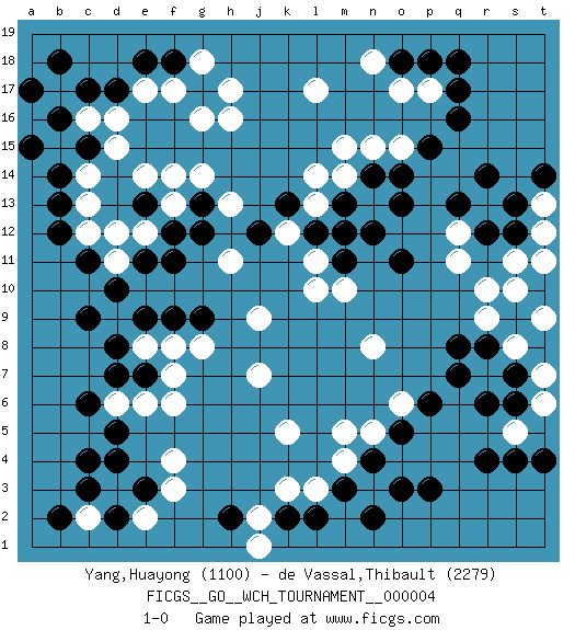 Last move : 1-0 2009 August 9 14:21:40 [Event "FICGS__GO__WCH_TOURNAMENT__000004"] [Site "FICGS"] [Date "2009.02.02"] [Round "1"] [Black "Yang,Huayong"] [White "de Vassal,Thibault"] [Result "1-0"] [Rating 1 "1100"] [Rating 2 "2279"] 1.q16 d16 2.r4 d3 3.p3 r10 4.d5 r7 5.c3 c2 6.c4 f4 7.b2 k3 8.m3 k5 9.e3 f3 10.d2 e2 11.d4 o17 12.r14 l17 13.q18 h16 14.c9 c13 15.c17 c16 16.d17 e17 17.e18 f17 18.f18 g18 19.g17 g16 20.b16 b17 21.b18 b15 22.a17 h17 23.e9 f6 24.e7 f7 25.g9 j7 26.r12 s5 27.s4 s11 28.s12 o15 29.o13 m14 30.s9 s10 31.r8 r9 32.q8 s8 33.s7 t9 34.r6 m4 35.n4 n3 36.n2 n5 37.o3 m5 38.q7 n8 39.o11 t11 40.o18 p17 41.p18 n18 42.q17 h13 43.c11 e12 44.b14 c14 45.a15 m12 46.c15 d15 47.b13 j9 48.f11 h11 49.m11 l11 50.n12 m10 51.m13 l13 52.l12 k12 53.m12 l10 54.n14 m15 55.p15 t12 56.s13 c12 57.b12 q11 58.f12 f13 59.e11 d11 60.e13 d12 61.d10 e14 62.g13 f14 63.g12 g14 64.o5 o6 65.p6 t7 66.s6 t6 67.t4 t13 68.t14 n15 69.o14 e6 70.d7 d6 71.c6 q12 72.q13 f8 73.f9 e8 74.d8 g8 75.k2 l3 76.l2 j2 77.h2 j1 78.k13 l14 79.j12 1-0 Comment by player 1 : Huayong Yang : Thank you for the game! Here are the names of the openings (joseki) played in the four corners : Corner d4 : d3 d5 Komoku (Somok, Xiao~mu`) 3-4 Point. The komoku (3-4) point is the traditional corner enclosure move.. Ikken Takagakari (Hankan Nop'dakeolch'im, Yi Gaogua`jiao~, 1-Space High Approach). The 5-4 approach move has become more popular in modern times, as modern Go emphasizes speed and influence. Corner q16 : q16 o17 Hoshi (Hwajeom, Seongjeom, Xingwei`) 4-4 Point. The star or hoshi (4-4) point, emphasizing influence at the potential expense of territory. Ikken Kakari (Hankan Keolch'im, Yi Gua`jiao~, 1-Space Low Approach). White 2 is the standard approach move to the 4-4. Player Black won this Go (weiqi, baduk) game. Follow this game move after move (download)There is damezumari at the bamboo joint. (Anonymous) . 'gn is not allowed in chess unless n is an integer between 1 and 8 inclusive, where 1 and 8 are to interpreted as the standard numerals standing for integers in the ordered real-closed field R, with the *canonical* ordering. (As opposed to, say, an integer in the domain Z[2+i*sqrt(5)] or an integer in some exotic Grothendieck topos). (Normajean Yates)