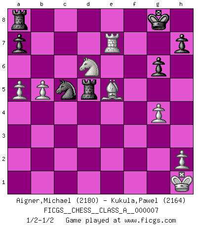 Last move : 1/2-1/2 2006 November 17 19:45:5 [Event "FICGS__CHESS__CLASS_A__000007"] [Site "FICGS"] [Date "2006.08.27"] [Round "1"] [White "Aigner,Michael"] [Black "Kukula,Pawel"] [Result "1/2-1/2"] [WhiteElo "2180"] [BlackElo "2164"] 1.e4 c5 2.Nf3 Nc6 3.d3 g6 4.g3 Bg7 5.Bg2 d6 6.Nbd2 e6 7.O-O Nge7 8.c3 O-O 9.a4 f5 10.Re1 Kh8 11.Nc4 e5 12.exf5 Nxf5 13.Bd2 Be6 14.b4 cxb4 15.cxb4 Qd7 16.Bc3 Bf6 17.b5 Nce7 18.g4 Nh4 19.Nxh4 Bxh4 20.Nxd6 Bxf2+ 21.Kh1 Kg8 22.Bxe5 Bxe1 23.Qxe1 Bd5 24.Bxd5+ Nxd5 25.Qe4 Qe6 26.Bg3 Nf4 27.Qxe6+ Nxe6 28.Nxb7 Rf7 29.Nd6 Rf3 30.a5 Rxd3 31.Re1 Nc5 32.Re7 Rd2 33.Bf4 Rd5 34.Be5 1/2-1/2 Sicilian defense Kingside Castling by player White (move 7) Kingside Castling by player Black (move 8) This chess game ended in a draw. Follow this game move after move (download)Only the player with the initiative has the right to attack. (Wilhelm Steinitz) Es ist im Leben wie im Schachspiel. Wir entwerfen einen Plan, dieser bleibt jedoch bedingt durch das, was im Schachspiel dem Gegner, im Leben dem Schicksal zu tun belieben wird. (Arthur Schopenhauer) Me dio la sensación de como si yo estuviera jugando en contra del mismo Ajedrez. - al estar jugando en contra de Robert Fischer (Walter Shipman) Lorsque vous vous retrouvez devant une position atroce, ne tendez pas un ultime piège dérisoire avec l'intention d'abandonner si l'adversaire le déjoue ! Faites-vous plutôt un devoir de résister comme si votre vie en dépendait. Jouez le coup qui vous déplairait au centuple si vous étiez dans la peau de votre tortionnaire ! I've never seen so many men wasted so badly. (Blondie in The Good, The Bad and The Ugly)