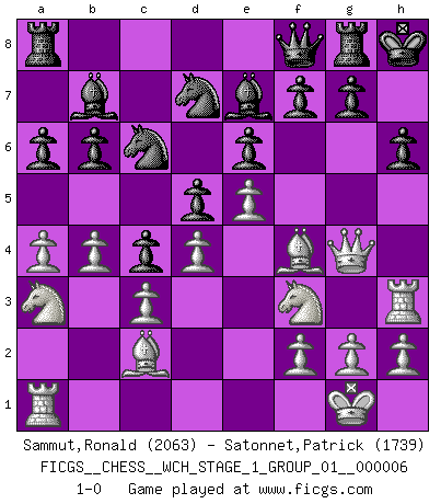 Last move : 1-0 2009 April 8 22:0:18 [Event "FICGS__CHESS__WCH_STAGE_1_GROUP_01__000006"] [Site "FICGS"] [Date "2009.02.03"] [Round "1"] [White "Sammut,Ronald"] [Black "Satonnet,Patrick"] [Result "1-0"] [WhiteElo "2063"] [BlackElo "1739"] 1.e4 e6 2.d4 b6 3.Nf3 Bb7 4.Bd3 c5 5.c3 Nf6 6.Qe2 Be7 7.O-O d5 8.e5 Nfd7 9.a3 Nc6 10.b4 c4 11.Bc2 h6 12.a4 Qc7 13.Na3 a6 14.Bf4 O-O 15.Nd2 Rfe8 16.Qg4 Kh8 17.Rfe1 Qd8 18.Re3 Rg8 19.Rh3 Qf8 20.Nf3 1-0 French defense Kingside Castling by player White (move 7) Kingside Castling by player Black (move 14) Player White won this chess game. Follow this game move after move (download)Via the squares on the chessboard, the Indians explain the movement of time and the age, the higher influences which control the world and the ties which link Chess with the human soul. (Al-Masudi) Schach ist die gewalttätigste aller Sportarten. (Garry Kasparov) La vida es como el Ajedrez, con lucha, competición y eventos buenos y malos. (Benjamin Franklin) Donnez-moi un Cavalier en 6e et je gagnerais toutes mes parties. (Steinitz) A generalist learns less and less about more and more until he knows nothing about everything. (Author unknown)