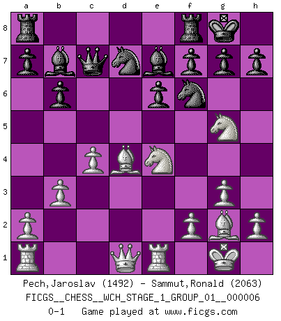 Last move : 0-1 2009 May 1 4:36:26 [Event "FICGS__CHESS__WCH_STAGE_1_GROUP_01__000006"] [Site "FICGS"] [Date "2009.02.03"] [Round "1"] [White "Pech,Jaroslav"] [Black "Sammut,Ronald"] [Result "0-1"] [WhiteElo "1492"] [BlackElo "2063"] 1.d4 Nf6 2.c4 e6 3.Nf3 b6 4.g3 Ba6 5.b3 Bb4+ 6.Bd2 Be7 7.Bg2 c6 8.Bc3 d5 9.Nbd2 Nbd7 10.O-O O-O 11.Re1 c5 12.e4 dxe4 13.Nxe4 Bb7 14.Nfg5 cxd4 15.Bxd4 Qc7 0-1 This chess game has been lost on time (started : 2009.02.03 12:31:21) Queen's Indian : Nimzovich variation (exaggerated Fianchetto) Kingside Castling by player White (move 10) Kingside Castling by player Black (move 10) Player Black won this chess game. Follow this game move after move (download)It is always better to sacrifice your opponent's men. (Savielly Tartakower) Man kann eine Schachpartie nur gewinnen, wenn das Gleichgewicht gestört ist. In einer Stellung mit ungestörtem Gleichgewicht ist auch das größte Genie hilflos - in der Stellung steckt dann eben kein genialer Einfall. (Wilhelm Steinitz) El Ajedrez hace al hombre ser mas sabio y ver mas claro. (Vladimir Putin) Lorsque vous vous retrouvez devant une position atroce, ne tendez pas un ultime piège dérisoire avec l'intention d'abandonner si l'adversaire le déjoue ! Faites-vous plutôt un devoir de résister comme si votre vie en dépendait. Jouez le coup qui vous déplairait au centuple si vous étiez dans la peau de votre tortionnaire ! Fear is the path to the dark side. Fear leads to anger; anger leads to hate; hate leads to suffering. I sense much fear in you. (Master Yoda in Star Wars ep.1)