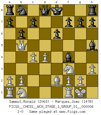 Last move : 1-0 2009 February 20 18:5:45 [Event "FICGS__CHESS__WCH_STAGE_1_GROUP_01__000006"] [Site "FICGS"] [Date "2009.02.03"] [Round "1"] [White "Sammut,Ronald"] [Black "Marques,Joao"] [Result "1-0"] [WhiteElo "2063"] [BlackElo "1478"] 1.e4 d5 2.exd5 Nf6 3.d4 Nxd5 4.Nf3 Bg4 5.Be2 e6 6.O-O Bd6 7.h3 Bh5 8.c4 Nf4 9.Bxf4 Bxf4 10.Qb3 b6 11.Qb5+ 1-0 Scandinavian : Marshall variation Kingside Castling by player White (move 6) Player White won this chess game. Follow this game move after move (download)The Pawns are the soul of the game. (Francois Andre Danican Philidor) Lisa Lane, amerikanische Schachmeisterin, hatte Fischer einmal als stärksten lebenden Spieler bezeichnet. Antwort: Das ist richtig, aber Lisa Lane ist eigentlich nicht in der Lage, das zu beurteilen. (Robert James Fischer) Repentinamente, me resultaba obvio en mi analisis que yo había pasado por alto lo que Fischer había visto en el tablero con la mas grande facilidad. (Mikhail Botvinnik) Un footballeur joue avec ses pieds, parfois avec sa tête. Un joueur d'échecs ne joue qu'avec sa tête. Et quand il ne joue plus, il meurt. (Jacob Murray) Over-the-board chess is the favorite of mortals, correspondence chess is the favorite of the gods. (Eduard Dyckhoff)
