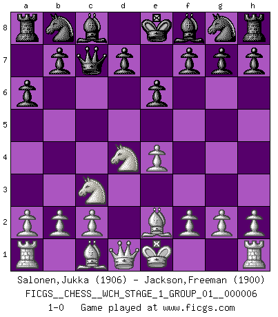Last move : 1-0 2009 March 13 22:38:45 [Event "FICGS__CHESS__WCH_STAGE_1_GROUP_01__000006"] [Site "FICGS"] [Date "2009.02.03"] [Round "1"] [White "Salonen,Jukka"] [Black "Jackson,Freeman"] [Result "1-0"] [WhiteElo "1906"] [BlackElo "1900"] 1.e4 c5 2.Nf3 e6 3.d4 cxd4 4.Nxd4 a6 5.Nc3 Qc7 6.Be2 1-0 This chess game has been lost on time (started : 2009.02.03 12:31:21) Sicilian : Kan, 5.Nc3 Player White won this chess game. Follow this game move after move (download)Chess opens and enriches your mind. (Saudin Robovic) Ich kämpfe solange mein Gegner einen Fehler machen kann. (Emanuel Lasker) Bobby Fischer es el jugador de Ajedrez mas grande que jamás haya existido. (Ken Smith) Si le désir cupide (et stupide) de gagner est une inépuisable source de souffrance, une combinaison brillante sur l'échiquier est une découverte : le coquelicot qui s'épanouit lorsque apparaît la Voie Lactée. (Arrabal) True nature is revealed in times of difficulty. (Chinese proverb)