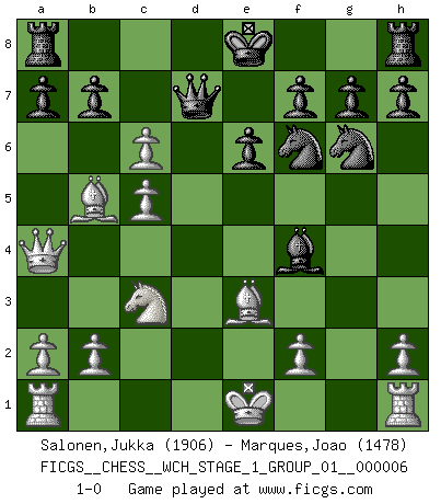 Last move : 1-0 2009 February 12 10:37:6 [Event "FICGS__CHESS__WCH_STAGE_1_GROUP_01__000006"] [Site "FICGS"] [Date "2009.02.03"] [Round "1"] [White "Salonen,Jukka"] [Black "Marques,Joao"] [Result "1-0"] [WhiteElo "1906"] [BlackElo "1478"] 1.e4 d5 2.exd5 Nf6 3.d4 Nxd5 4.Nf3 Bg4 5.Be2 Nc6 6.c4 Nf6 7.d5 Bxf3 8.gxf3 Ne5 9.f4 Ng6 10.Nc3 e6 11.Be3 Bd6 12.c5 Bxf4 13.Qa4+ Qd7 14.Bb5 c6 15.dxc6 1-0 Scandinavian : Marshall variation Player White won this chess game. Follow this game move after move (download)What is the object of playing a gambit opening?... To acquire a reputation of being a dashing player at the cost of losing a game. (Siegbert Tarrasch) Schach ist gnadenlos. Du mußt bereit sein zu töten. (Nigel Short) Cada Peón es una Reina en potencia. (James Mason) Les pièces de l'échiquier étaient impitoyables. Elles le retenaient, elles l'absorbaient. Il y avait de l'horreur en cela, mais aussi une harmonie unique. Car, qu'y a-t-il dans le monde, à part les échecs ? (V. Nabokov) Life is the sum of all your choices. (Albert Camus)