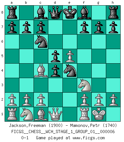Last move : 0-1 2009 March 14 22:47:18 [Event "FICGS__CHESS__WCH_STAGE_1_GROUP_01__000006"] [Site "FICGS"] [Date "2009.02.03"] [Round "1"] [White "Jackson,Freeman"] [Black "Mamonov,Petr"] [Result "0-1"] [WhiteElo "1900"] [BlackElo "1740"] 1.e4 e5 2.Bc4 Nf6 3.d4 Nc6 4.Nf3 exd4 5.e5 Ne4 6.O-O d5 0-1 This chess game has been lost on time (started : 2009.02.03 12:31:21) Bishop's Opening : Ponziani gambit Kingside Castling by player White (move 6) Player Black won this chess game. Follow this game move after move (download)Of all my Russian books, the defense contains and diffuses the greatest 'warmth' which may seem odd seeing how supremely abstract Chess is supposed to be. (Vladimir Nabokov) Schon mancher Spieler hat aufgegeben, um zu vermeiden, daß er eine Figur verliert. (Savielly Grigorievitsch Tartakower) Solo puedes ser bueno en el Ajedrez si amas al juego. (Bobby Fischer) Les erreurs sont comme les malheurs, elles n'arrivent jamais seules. (Siegbert Tarrasch) Creativity is inventing, experimenting, growing, taking risks, breaking rules, making mistakes, and having fun. (Mary Lou Cook)