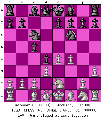 Last move : 1-0 2009 March 17 11:3:7 [Event "FICGS__CHESS__WCH_STAGE_1_GROUP_01__000006"] [Site "FICGS"] [Date "2009.02.03"] [Round "1"] [White "Satonnet,Patrick"] [Black "Jackson,Freeman"] [Result "1-0"] [WhiteElo "1739"] [BlackElo "1900"] 1.e4 c5 2.f4 d5 3.Nc3 d4 4.Nce2 Nc6 5.d3 Nf6 6.h3 1-0 This chess game has been lost on time (started : 2009.02.03 12:31:21) Sicilian : Grand Prix attack Player White won this chess game. Follow this game move after move (download)You know, comrade Pachman, I don't enjoy being a Minister, I would rather play Chess like you. (Che Guevara) Nach Morphy wurde nichts neues mehr in der Behandlung offener Positionen gefunden. (Mikhail Moiseyevich Botvinik) Aún el Rey más flojo huye despavorido ante la amenaza de un Jaque doble. (Aaron Nimzowitsch) Il s'avisa de me proposer d'apprendre les échecs qu'il jouait un peu... me voilà forcené des échecs. J'achète un échiquier, je m'enferme dans ma chambre, j'y passe des jours et des nuits à vouloir apprendre par cur toutes les parties. (Jean-Jacques Rousseau, Confessions) SEO proverb : Make your website optimized for human beings, not for search engines.
