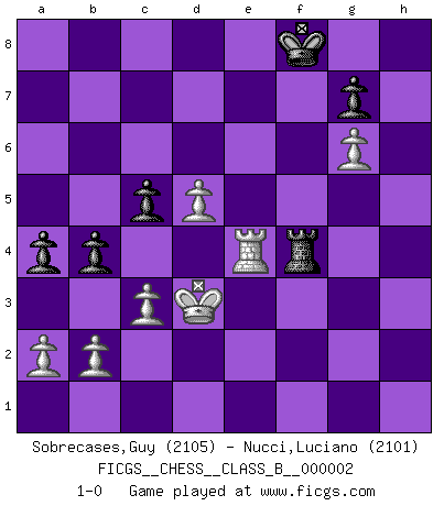 Last move : 1-0 2006 October 17 9:54:8 [Event "FICGS__CHESS__CLASS_B__000002"] [Site "FICGS"] [Date "2006.04.16"] [Round "1"] [White "Sobrecases,Guy"] [Black "Nucci,Luciano"] [Result "1-0"] [WhiteElo "2105"] [BlackElo "2101"] 1.e4 c5 2.Nf3 d6 3.d4 cxd4 4.Nxd4 Nf6 5.Nc3 a6 6.Be3 e5 7.Nb3 Be6 8.Qd2 Be7 9.f3 O-O 10.O-O-O Nbd7 11.g4 Qc7 12.Kb1 Rfc8 13.h4 b5 14.h5 b4 15.Nd5 Bxd5 16.exd5 Nb6 17.Bxb6 Qxb6 18.g5 Nd7 19.g6 h6 20.gxf7+ Kxf7 21.Bh3 Rc7 22.Be6+ Ke8 23.Qg2 Bg5 24.f4 exf4 25.Bxd7+ Rxd7 26.Nd4 Kf8 27.Ne6+ Kg8 28.Nxg5 hxg5 29.Qxg5 Qe3 30.Rde1 Qg3 31.Qg6 Qxg6 32.hxg6 Rb7 33.Rh4 Rd8 34.Reh1 Kf8 35.Rxf4+ Kg8 36.Kc1 a5 37.Rfh4 Kf8 38.Re4 Kg8 39.Rc4 Rb5 40.Rh5 Rc5 41.Rxc5 dxc5 42.Kd2 Rd6 43.Rg5 Rf6 44.Kd3 Rf4 45.Re5 Kf8 46.c3 a4 47.Re4 1-0 Sicilian : Najdorf, Byrne (English) attack Kingside Castling by player Black (move 9) Queenside Castling by player White (move 10) Player White won this chess game. Follow this game move after move (download)To avoid losing a piece, many a person has lost the game. (Savielly Tartakover) Versuche, dich von der Sklaverei der Eröffnungsvarianten zu befreien. Stattdessen soll man gewisse Typenpositionen erlernen, die man eingehend analysiert. (Aaron Nimzowitsch) El jugador táctico sabe que hacer cuando hay algo que hacer; mientras que el estratega sabe que hacer cuando no hay nada que hacer. (Gerald Abrahams) Il n'y a plus de joueurs du niveau de Jacob Murray dont la seule quête est le beau jeu, le plaisir de voir les pièces construire quelque chose. Sur 10 idées à la minute, 9 seront sans intérêt, la dernière s'avèrera géniale. (Christian Bauer) Hold em is to stud what chess is to checkers. (Johnny Moss)