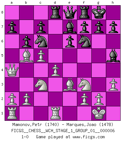 Last move : 1-0 2009 February 9 14:12:2 [Event "FICGS__CHESS__WCH_STAGE_1_GROUP_01__000006"] [Site "FICGS"] [Date "2009.02.03"] [Round "1"] [White "Mamonov,Petr"] [Black "Marques,Joao"] [Result "1-0"] [WhiteElo "1740"] [BlackElo "1478"] 1.e4 d5 2.exd5 Nf6 3.d4 Nxd5 4.c4 Nf6 5.Nf3 Bg4 6.Be2 e6 7.Qb3 b6 8.O-O Be7 9.h3 Bh5 10.Nc3 O-O 11.Be3 Nc6 12.Rfd1 Rc8 13.Qa4 Qe8 14.c5 Rd8 15.Bb5 1-0 Scandinavian : Marshall variation Kingside Castling by player White (move 8) Kingside Castling by player Black (move 10) Player White won this chess game. Follow this game move after move (download)Even the laziest King flees wildly in the face of a double check ! (Aaron Nimzowitsch) Ein Kibitz ist einer, der deinem Gegner gute Ratschläge gibt. (Andrew Soltis) El Ajedrez era la lengua materna de Capablanca. (Reti) Le génie consiste à savoir transgresser les règles au moment opportun. (Teichmann) There is a very easy way to return from a casino with a small fortune : go there with a large one. (Jack Yelton)