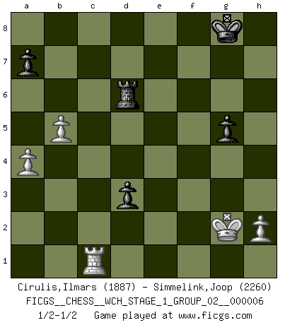 Last move : 1/2-1/2 2009 May 23 14:45:0 [Event "FICGS__CHESS__WCH_STAGE_1_GROUP_02__000006"] [Site "FICGS"] [Date "2009.02.03"] [Round "1"] [White "Cirulis,Ilmars"] [Black "Simmelink,Joop"] [Result "1/2-1/2"] [WhiteElo "1887"] [BlackElo "2260"] 1.d4 Nf6 2.c4 g6 3.Nc3 Bg7 4.e4 d6 5.f4 O-O 6.Nf3 e5 7.dxe5 dxe5 8.Qxd8 Rxd8 9.Nxe5 Nxe4 10.Nxe4 f6 11.c5 fxe5 12.Bc4+ Kf8 13.Ng5 h6 14.fxe5 hxg5 15.O-O Bf5 16.g4 Bxe5 17.gxf5 Bf6 18.fxg6 Kg7 19.Be3 Nc6 20.Rae1 Re8 21.Bd3 Nb4 22.Bb1 Rxe3 23.Rxe3 Bd4 24.Rf7+ Kg8 25.a3 Bxe3+ 26.Kg2 Nd5 27.Ba2 c6 28.Rxb7 Rf8 29.Bxd5+ cxd5 30.b4 d4 31.Rd7 Rf6 32.a4 Rxg6 33.b5 d3 34.c6 Bb6 35.c7 Bxc7 36.Rxc7 Rd6 37.Rc1 1/2-1/2 King's Indian : Four pawns attack Kingside Castling by player Black (move 5) Kingside Castling by player White (move 15) 10 pieces endgame at move 36 : White KRPPP , Black KRPPP WHITE : King + 1 Rook 3 Pawns BLACK : King + 1 Rook 3 Pawns This chess game ended in a draw. Follow this game move after move (download)In Chess, at least, the brave inherit the earth. (Edmar Mednis) Oft bringt ein stiller Zug das Erdbeben. (Richard Reti) Todo se encuentra en un estado de flujo y esto incluye al mundo del Ajedrez. (Mikhail Botvinnik) Soyez une menace à chaque fois que vous vous asseyez pour jouer. (Ken Smith) Life is like a ten-speed bicycle: most of us have gears we never use. (Charles M. Schulz)