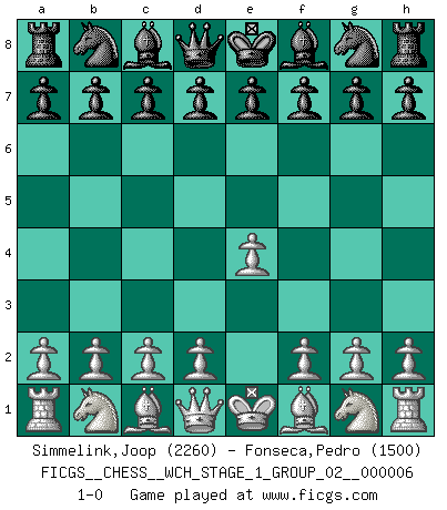 Last move : 1-0 2009 March 5 22:16:36 [Event "FICGS__CHESS__WCH_STAGE_1_GROUP_02__000006"] [Site "FICGS"] [Date "2009.02.03"] [Round "1"] [White "Simmelink,Joop"] [Black "Fonseca,Pedro"] [Result "1-0"] [WhiteElo "2260"] [BlackElo "1500"] 1.e4 1-0 This chess game has been lost on time (started : 2009.02.03 12:34:34) King's pawn Opening Player White won this chess game. Follow this game move after move (download)Play the opening like a book, the middle game like a magician, and the endgame like a machine. (Spielmann) Charakterschwächen offenbaren sich normalerweise während einer Schachpartie. (Garry Kasparov) No hay precio que sea tan grande por la cabellera del Rey enemigo. (Koblentz) Mon pion favori sur ma case favorite ! Bronstein en parlant d'un coup de pion en h5 quand il avait les Noirs. The Internet is so big, so powerful and pointless that for some people it is a complete substitute for life. (Andrew Brown)
