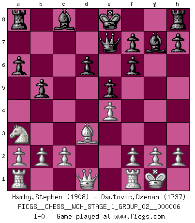 Last move : 1-0 2009 April 15 2:47:7 [Event "FICGS__CHESS__WCH_STAGE_1_GROUP_02__000006"] [Site "FICGS"] [Date "2009.02.03"] [Round "1"] [White "Hamby,Stephen"] [Black "Dautovic,Dzenan"] [Result "1-0"] [WhiteElo "1908"] [BlackElo "1737"] 1.e4 c5 2.Nf3 Nc6 3.d4 cxd4 4.Nxd4 Nf6 5.Nc3 e5 6.Ndb5 d6 7.Bg5 a6 8.Na3 b5 9.Bxf6 gxf6 10.Nd5 Bg7 11.Bd3 Ne7 12.Nxe7 Qxe7 13.O-O 1-0 This chess game has been lost on time (started : 2009.02.03 12:34:34) Sicilian : Pelikan (Lasker/Sveshnikov) variation Kingside Castling by player White (move 13) Player White won this chess game. Follow this game move after move (download)Bobby just drops the pieces and they fall on the right squares. (Miguel Najdorf) Ich bewundere Kasparows phantasievolle Angriffssiege aus den Achtzigern und Neunzigern, aber wenn man sie mit dem Computer überprüft, nimmt der Computer in jeder zweiten Partie die Opfer an, verteidigt sich und gewinnt. (Vladimir Kramnik) Los problemas de Ajedrez exigen del compositor las mismas virtudes que caracterizan todo el arte de valor: originalidad, invención, concisión, armonía, complejidad e insinceridad explendida. (Vladimir Nabokov) Soyez une menace à chaque fois que vous vous asseyez pour jouer. (Ken Smith) The difference between stupidity and genius is that genius has its limits. (Murphy)