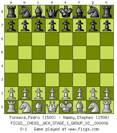 Last move : 0-1 2009 March 5 22:16:36 [Event "FICGS__CHESS__WCH_STAGE_1_GROUP_02__000006"] [Site "FICGS"] [Date "2009.02.03"] [Round "1"] [White "Fonseca,Pedro"] [Black "Hamby,Stephen"] [Result "0-1"] [WhiteElo "1500"] [BlackElo "1908"] 0-1 This chess game has been lost on time (started : 2009.02.03 12:34:34) Player Black won this chess game. Follow this game move after move (download)You can only get good at Chess if you love the game. (Bobby Fischer) Als ich elf wurde, wurde ich einfach gut. (Robert James Fischer) El Ajedrez lo es todo: arte, ciencia y deporte. (Anatoly Karpov) Comme les marins qui ont mille raisons différentes d'aller en mer, les joueurs d'échecs en ont tout autant avant de s'installer devant une table et jouer... (Vincent Bertignac, philosophe) The age of a woman doesn't mean a thing. The best tunes are played on the oldest fiddles. (Ralph Waldo Emerson)