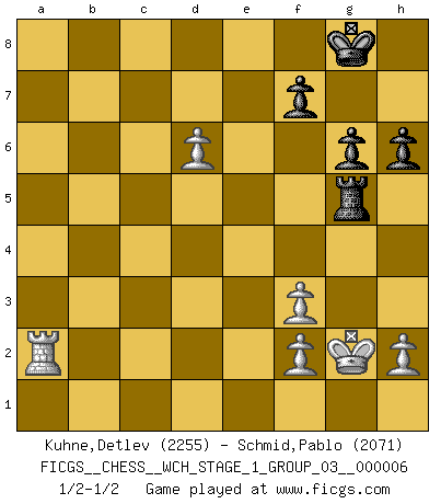 Last move : 1/2-1/2 2009 May 26 10:21:31 [Event "FICGS__CHESS__WCH_STAGE_1_GROUP_03__000006"] [Site "FICGS"] [Date "2009.02.03"] [Round "1"] [White "Kuhne,Detlev"] [Black "Schmid,Pablo"] [Result "1/2-1/2"] [WhiteElo "2255"] [BlackElo "2071"] 1.d4 Nf6 2.c4 g6 3.Nc3 d5 4.cxd5 Nxd5 5.e4 Nxc3 6.bxc3 c5 7.Nf3 Bg7 8.Rb1 O-O 9.Be2 cxd4 10.cxd4 Qa5+ 11.Bd2 Qxa2 12.O-O Bg4 13.Bg5 h6 14.Be3 Nc6 15.d5 Bxf3 16.Bxf3 Ne5 17.Rxb7 a5 18.Rxe7 a4 19.Bd4 Nxf3+ 20.gxf3 Bxd4 21.Qxd4 a3 22.d6 Qb2 23.Qd5 Qf6 24.e5 Qf5 25.Ra1 Ra4 26.Kf1 Qh3+ 27.Ke2 Rb4 28.Rb7 Rxb7 29.Qxb7 Qe6 30.Qe4 a2 31.Kf1 Re8 32.Kg2 Qxe5 33.Qxe5 Rxe5 34.Rxa2 Rg5+ 1/2-1/2 King's Indian defense, 3.Nc3 Kingside Castling by player Black (move 8) Kingside Castling by player White (move 12) This chess game ended in a draw. Follow this game move after move (download)Bobby Fischer is the greatest Chess genius of all time ! (Alexander Kotov) Ich hatte Zahnschmerzen im ersten Spiel. In der zweiten Partie tat mir der Kopf weh. In der dritten war es eine Rheuma-Attacke und während der vierten fühlte ich mich nicht gut. Und in der fünften? Nun, man muss doch nicht jedes Spiel gewinnen, oder? (Savielly Grigorievitsch Tartakower) Me siento como si fuera una pieza en una partida de Ajedrez, cuando mi oponente me indica: esa pieza no puede ser movida. (Soren Kierkegaard) Ce qui caractérise les parties de combat, c'est que si le défenseur a constamment de difficiles problèmes à résoudre, l'attaquant doit chercher sans relâche de nouvelles possibilités d'attaque. (Koblentz) Employ the attack like tactic of defense. (Chinese proverb)