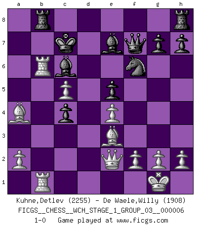 Last move : 1-0 2009 March 20 23:9:5 [Event "FICGS__CHESS__WCH_STAGE_1_GROUP_03__000006"] [Site "FICGS"] [Date "2009.02.03"] [Round "1"] [White "Kuhne,Detlev"] [Black "De Waele,Willy"] [Result "1-0"] [WhiteElo "2255"] [BlackElo "1908"] 1.d4 d5 2.c4 c6 3.Nf3 Nf6 4.Nc3 e6 5.e3 Nbd7 6.Bd3 dxc4 7.Bxc4 b5 8.Bd3 Bb7 9.O-O a6 10.e4 c5 11.d5 Qc7 12.dxe6 fxe6 13.Bc2 c4 14.Nd4 Nc5 15.Be3 O-O-O 16.Qe2 e5 17.Ndxb5 axb5 18.Nxb5 Qf7 19.Rfc1 Ba6 20.b4 Bxb5 21.bxc5 Bc6 22.Rab1 Be7 23.Rb6 Kc7 24.Rcb1 Rb8 25.Ba4 1-0 QGD Slav : 4.Nc3 Kingside Castling by player White (move 9) Queenside Castling by player Black (move 15) Player White won this chess game. Follow this game move after move (download)In order to improve your game, you must study the endgame before everything else, for whereas the endings can be studied and mastered by themselves, the middle game and the opening must be studied in relation to the endgame. (Jose Raul Capablanca) Über Frauen: Chess is better. (Robert James Fischer) Personalmente, yo prefiero mirar hacia el futuro en donde un programa de computadora gane el título mundial de Ajedrez. La humanidad necesita una lección de humildad. (Richard Dawkings) Je ne crois pas en la psychologie, je crois aux bons coups. (Robert Fischer) Man is reluctant to give credit for intelligence to anyone, except his enemies. (Albert Einstein)