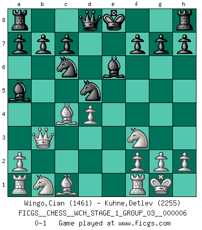 Last move : 0-1 2009 March 27 12:8:16 [Event "FICGS__CHESS__WCH_STAGE_1_GROUP_03__000006"] [Site "FICGS"] [Date "2009.02.03"] [Round "1"] [White "Wingo,Cian"] [Black "Kuhne,Detlev"] [Result "0-1"] [WhiteElo "1461"] [BlackElo "2255"] 1.e4 e5 2.Nf3 Nc6 3.Bc4 Bc5 4.b4 Bxb4 5.c3 Ba5 6.d4 exd4 7.O-O Nge7 8.cxd4 d5 9.exd5 Nxd5 10.Qb3 Be6 0-1 This chess game has been lost on time (started : 2009.02.03 12:36:31) Evans gambit Kingside Castling by player White (move 7) Player Black won this chess game. Follow this game move after move (download)Daring ideas are like Chess men moved forward. They may be beaten, but they may start a winning game. (Johann Wolfgang von Goethe) Die Fehler sind da, Sie warten nur darauf gemacht zu werden. (Savielly Grigorievitsch Tartakower) El jugador táctico debe saber que hacer cuando algo se debe de hacer. El estratégico debe saber que hacer cuando nada se debe de hacer. (Savielly Tartakover) Soyez une menace à chaque fois que vous vous asseyez pour jouer. (Ken Smith) The leaves of memory seemed to make a mournful rustling in the dark. (Henry Wadsworth Longfellow)