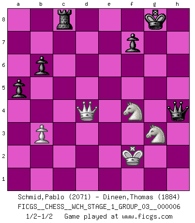 Last move : 1/2-1/2 2009 June 11 1:5:7 [Event "FICGS__CHESS__WCH_STAGE_1_GROUP_03__000006"] [Site "FICGS"] [Date "2009.02.03"] [Round "1"] [White "Schmid,Pablo"] [Black "Dineen,Thomas"] [Result "1/2-1/2"] [WhiteElo "2071"] [BlackElo "1884"] 1.d4 Nf6 2.f3 d5 3.e4 dxe4 4.Nc3 exf3 5.Nxf3 g6 6.Bc4 Bg7 7.O-O O-O 8.Qe1 Bf5 9.Qh4 Nc6 10.h3 Bxc2 11.Bh6 Bxh6 12.Qxh6 Nxd4 13.Ng5 Nf5 14.Rxf5 gxf5 15.Nd5 f4 16.Rd1 Qd6 17.Rd3 Bxd3 18.Bxd3 Kh8 19.Nxf4 Qc5+ 20.Kh2 Qc6 21.Qh4 Kg7 22.Nxh7 Rg8 23.Qg5+ Kh8 24.Qh4 Rxg2+ 25.Nxg2 Qd6+ 26.Kh1 Qxd3 27.Nxf6 Kg7 28.Ne4 Rd8 29.Kh2 Qd4 30.Qxe7 Rd5 31.Ng3 Qe5 32.Qb4 a5 33.Qg4+ Kf8 34.b3 Qe6 35.Qh4 b6 36.Qh8+ Ke7 37.Qh4+ Qf6 38.Qg4 Rd2 39.h4 Rxa2 40.h5 Kf8 41.Kh3 Rd2 42.Nf4 Rf2 43.Nd3 Rc2 44.Nf4 Rc3 45.Kg2 Qc6+ 46.Kf2 Rc2+ 47.Nge2 Qf6 48.Kf3 Rc5 49.Ng3 Qc6+ 50.Kf2 Re5 51.h6 Qxh6 52.Qc8+ Re8 53.Qxc7 Qh4 54.Qd6+ Kg8 55.Qd4 Rc8 1/2-1/2 Blackmar-Diemer gambit Kingside Castling by player White (move 7) Kingside Castling by player Black (move 7) This chess game ended in a draw. Follow this game move after move (download)The passed pawn is a criminal, who should be kept under lock and key. Mild measures, such as police surveillance, are not sufficient. (Nimzovitch) Ich hatte meine größten Erfolge, als ich 47 Jahre alt war. Kasparow war noch nicht mal 42 und hat das Schach schon im Stich gelassen. (Viktor Kortschnoi) Con o sin el título, Bobby Fischer fue sin lugar a dudas el mas grande jugador de su época. (Burt Hochberg) Mon pion favori sur ma case favorite ! Bronstein en parlant d'un coup de pion en h5 quand il avait les Noirs. I'm extremely disappointed. I send you out for exciting, new designer drugs, you come back with tomato sauce. (Gregory House, House M.D.)