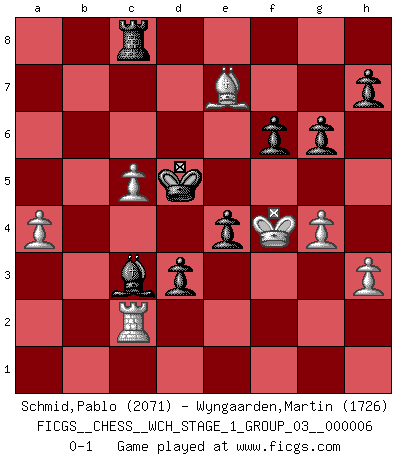 Last move : 0-1 2009 April 28 4:19:43 [Event "FICGS__CHESS__WCH_STAGE_1_GROUP_03__000006"] [Site "FICGS"] [Date "2009.02.03"] [Round "1"] [White "Schmid,Pablo"] [Black "Wyngaarden,Martin"] [Result "0-1"] [WhiteElo "2071"] [BlackElo "1726"] 1.d4 d5 2.e4 dxe4 3.Nc3 Nf6 4.f3 exf3 5.Nxf3 g6 6.Bc4 Bg7 7.O-O O-O 8.Qe1 Nc6 9.Qh4 Bg4 10.Be3 e6 11.Ne5 Bf5 12.Nxc6 bxc6 13.h3 Nd5 14.Qxd8 Rfxd8 15.Nxd5 cxd5 16.Bb3 a5 17.c3 c5 18.Rac1 Rdb8 19.Rf2 a4 20.Bd1 a3 21.bxa3 Rxa3 22.dxc5 Rxc3 23.Rxc3 Bxc3 24.Bc2 Bxc2 25.Rxc2 d4 26.Bf4 Rc8 27.Bd6 f6 28.a4 Kf7 29.Kf2 e5 30.Kf3 Ke6 31.g4 Kd5 32.Be7 e4+ 33.Kf4 d3 0-1 This chess game has been lost on time (started : 2009.02.03 12:36:31) Blackmar gambit Kingside Castling by player White (move 7) Kingside Castling by player Black (move 7) Player Black won this chess game. Follow this game move after move (download)Those who say they understand Chess, understand nothing. (Robert Hubner) Schach ist ein Kampf gegen den Fehler. (Johannes Herrman Zukertort) Dios mío, Bobby Fischer juega tan simple. (Alexei Suetin) Une platitude souvent récitée à propos des Echecs est qu'une des choses les plus difficiles à réaliser est de gagner une position gagnante. Cela ne manque pas de sens mais, pour ma part, j'ai toujours trouvé plus difficile de gagner une position perdante. (Tim Krabbe) I feel so... helpless. (C-3PO in Star Wars ep.3)