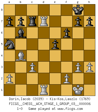 Last move : 1-0 2009 March 27 3:6:27 [Event "FICGS__CHESS__WCH_STAGE_1_GROUP_03__000006"] [Site "FICGS"] [Date "2009.02.03"] [Round "1"] [White "Dorin,Iacob"] [Black "Kis-Kos,Laszlo"] [Result "1-0"] [WhiteElo "2039"] [BlackElo "1769"] 1.Nf3 d5 2.d4 Nf6 3.g3 e6 4.Bg2 c5 5.O-O Nc6 6.c4 cxd4 7.Nxd4 Bc5 8.Nb3 Bb6 9.cxd5 Nxd5 10.Nc3 Nxc3 11.bxc3 Qxd1 12.Rxd1 O-O 13.Ba3 Re8 14.Nd2 e5 15.Nc4 Bg4 16.Nd6 Bxe2 17.Rd2 Bg4 18.Nxe8 Rxe8 19.Re1 f6 20.h3 Be6 21.Bd5 Bxd5 22.Rxd5 Rc8 23.Rd7 Na5 24.Bb4 Rc7 25.Red1 1-0 Reti Opening Kingside Castling by player White (move 5) Kingside Castling by player Black (move 12) Player White won this chess game. Follow this game move after move (download)I believe that Chess possesses a magic that is also a help in advanced age. A rheumatic knee is forgotten during a game of Chess and other events can seem quite unimportant in comparison with a catastrophe on the chessboard. (Vlastimil Hort) Frage: Was machen Sie mit den Preisen? Anwort: Ich habe Angst, dass meine Freundin davon neue Kleider kauft. (Loek van Wely) Uno por uno, yo los acribillé, mi superioridad muy pronto se volvio aparente. (Jose Capablanca) Les Echecs sont affaire de jugement sensible. Savoir quand frapper et quand esquiver. (Fischer) To steal ideas from one person is plagiarism. To steal from many is research. (Unknown)
