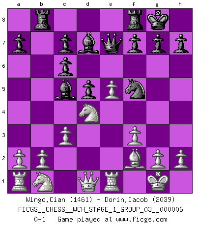 Last move : 0-1 2009 March 30 1:33:27 [Event "FICGS__CHESS__WCH_STAGE_1_GROUP_03__000006"] [Site "FICGS"] [Date "2009.02.03"] [Round "1"] [White "Wingo,Cian"] [Black "Dorin,Iacob"] [Result "0-1"] [WhiteElo "1461"] [BlackElo "2039"] 1.e4 e5 2.Nf3 Nc6 3.Bc4 Nf6 4.d4 exd4 5.e5 d5 6.Bb5 Ne4 7.Nxd4 Bd7 8.Bxc6 bxc6 9.O-O Bc5 10.Be3 Qe7 11.f3 Nd6 12.Bf2 Nf5 13.c3 O-O 14.Re1 Rab8 0-1 This chess game has been lost on time (started : 2009.02.03 12:36:31) Two knights defense Kingside Castling by player White (move 9) Kingside Castling by player Black (move 13) Player Black won this chess game. Follow this game move after move (download)In Chess, at least, the brave inherit the earth. (Edmar Mednis) Je älter ich werde, um so mehr schätze ich die Bauern. (Paul Keres) Nunca nadie ha ganado una partida de Ajedrez rindiendose. (Unknown) Ce qui caractérise les parties de combat, c'est que si le défenseur a constamment de difficiles problèmes à résoudre, l'attaquant doit chercher sans relâche de nouvelles possibilités d'attaque. (Koblentz) A good player is always lucky. (Capablanca)