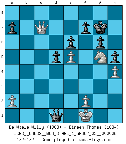 Last move : 1/2-1/2 2009 March 21 21:34:56 [Event "FICGS__CHESS__WCH_STAGE_1_GROUP_03__000006"] [Site "FICGS"] [Date "2009.02.03"] [Round "1"] [White "De Waele,Willy"] [Black "Dineen,Thomas"] [Result "1/2-1/2"] [WhiteElo "1908"] [BlackElo "1884"] 1.e4 e6 2.d4 d5 3.Nc3 Nf6 4.Bg5 Bb4 5.e5 h6 6.Bd2 Bxc3 7.bxc3 Ne4 8.Qg4 g6 9.Bd3 Nxd2 10.Kxd2 c5 11.h4 Nc6 12.Qf4 cxd4 13.cxd4 Qa5+ 14.c3 b5 15.Ne2 b4 16.Rhc1 Ba6 17.Bxa6 Qxa6 18.Ke1 Rb8 19.Qd2 Rb6 20.cxb4 Nxb4 21.Kf1 Nc6 22.Rab1 Rxb1 23.Rxb1 h5 24.g3 O-O 25.Kg2 Rb8 26.Rxb8+ Nxb8 27.Ng1 Nc6 28.Nf3 Ne7 29.Ng5 Nf5 30.Qc2 Qc4 31.Qb2 Qxd4 32.Qb8+ Kg7 33.Qc7 Nxh4+ 34.gxh4 Qg4+ 35.Kf1 Qd1+ 1/2-1/2 French : MacCutcheon, Lasker variation Kingside Castling by player Black (move 24) This chess game ended in a draw. Follow this game move after move (download)No other master has such a terrific will to win. At the board he radiates danger, and even the strongest opponents tend to freeze, like rabbits when they smell a panther. Even his weaknesses are dangerous. As white, his opening game is predictable - you can make plans against it - but so strong that your plans almost never work. In the middle game his precision and invention are fabulous, and in the end game you simply cannot beat him. (Anonymous German Expert) Wir irren allesamt, nur jeder irrt anders. (Georg Christoph Lichtenberg) El Ajedrez es tan inspirador que yo no creo que un buen jugador sea capaz de tener un pensamiento malo durante una partida. (Wilhelm Steinitz) Vous savez, camarade Pachman, je n'éprouve pas de plaisir à être ministre, je jouerais plutôt aux échecs comme vous, ou alors ferais une révolution au Venezuela. (Che Guevara à Ludek Pachman, 'Checkmate in Prague', 1975) A journey of a thousand sites begins with a single click. (Author unknown)