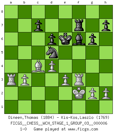 Last move : 1-0 2009 March 17 20:29:47 [Event "FICGS__CHESS__WCH_STAGE_1_GROUP_03__000006"] [Site "FICGS"] [Date "2009.02.03"] [Round "1"] [White "Dineen,Thomas"] [Black "Kis-Kos,Laszlo"] [Result "1-0"] [WhiteElo "1884"] [BlackElo "1769"] 1.d4 Nf6 2.c4 g6 3.Nc3 d5 4.Nf3 Bg7 5.Qb3 dxc4 6.Qxc4 O-O 7.e4 a6 8.e5 b5 9.Qb3 Nfd7 10.Be3 Bb7 11.e6 Nf6 12.Ng5 Bd5 13.Nxd5 Nxd5 14.Nxf7 Rxf7 15.exf7+ Kxf7 16.a4 bxa4 17.Qxa4 Nd7 18.Qc6 N7b6 19.Bxa6 Qd6 20.Qxd6 exd6 21.O-O Re8 22.Bb5 Re7 23.Ra3 Nxe3 24.fxe3 Bf6 25.Rf3 Ke6 26.b3 Rf7 27.Kf2 Nd5 28.Bc4 1-0 King's Indian defense, 3.Nc3 Kingside Castling by player Black (move 6) Kingside Castling by player White (move 21) Player White won this chess game. Follow this game move after move (download)If I win a tournament, I win it by myself. I do the playing. Nobody helps me. (Bobby Fischer) Wenn ich einen Club besuche, sind die Spieler stumm vor Staunen. (José Raúl Capablanca) En posiciones complicadas, Bobby Fischer pocas veces tuvo que temer de cualquiera. (Paul Keres) Il vaut mieux sacrifier les pièces de l'adversaire. (Xavier Tartacover) Just because you do not take an interest in politics doesn't mean politics won't take an interest in you. (Pericles 430 B.C.)