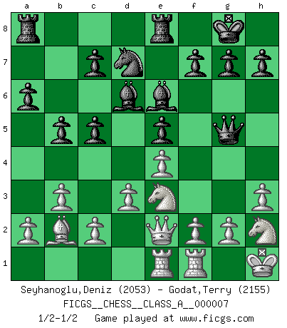 Last move : 1/2-1/2 2006 October 24 12:41:41 [Event "FICGS__CHESS__CLASS_A__000007"] [Site "FICGS"] [Date "2006.08.27"] [Round "1"] [White "Seyhanoglu,Deniz"] [Black "Godat,Terry"] [Result "1/2-1/2"] [WhiteElo "2053"] [BlackElo "2155"] 1.e4 e5 2.Nf3 Nc6 3.Bb5 a6 4.Ba4 Nf6 5.Bxc6 dxc6 6.d3 Nd7 7.Nbd2 Bd6 8.Nc4 O-O 9.O-O b5 10.Ne3 Nc5 11.b3 Be6 12.Bb2 Qf6 13.h3 Rfe8 14.Qe2 Nd7 15.Nh2 Qg5 16.Kh1 c5 17.Rae1 1/2-1/2 Comment by player 2 : Terry Godat : Thanks for the game! Ruy Lopez : Treybal (Bayreuth) variation (Exchange var. deferred) Kingside Castling by player Black (move 8) Kingside Castling by player White (move 9) This chess game ended in a draw. Follow this game move after move (download)Chess is life. (Bobby Fischer) Glücklicherweise sind Großmeister Ruben Fines reine Schachbücher weniger phallozentrisch [als seine Schachpsychologie] und deswegen auch weniger lächerlich. (Nigel Short) Coloca el contenido de las piezas del Ajedrez en un sombrero, agitalo vigorosamente, arrojalas en un tablero desde una altura de 30 centimetros y así obtendras el estilo de Steinitz. (H. E. Bird) Fischer est le meilleur joueur du monde et Karpov n'est qu'un joueur de bistrot. (Garry Kasparov, agé de 16 ans) The worth of a book is to be measured by what you can carry away from it. (James Bryce)