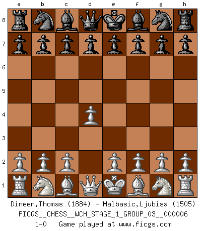 Last move : 1-0 2009 March 5 22:16:36 [Event "FICGS__CHESS__WCH_STAGE_1_GROUP_03__000006"] [Site "FICGS"] [Date "2009.02.03"] [Round "1"] [White "Dineen,Thomas"] [Black "Malbasic,Ljubisa"] [Result "1-0"] [WhiteElo "1884"] [BlackElo "1505"] 1.d4 1-0 This chess game has been lost on time (started : 2009.02.03 12:36:31) Queen's pawn Player White won this chess game. Follow this game move after move (download)Not only will I predict his triumph over Botvinnik, but I'll go further and say that he'll probably be the greatest Chess player that ever lived. (John Collins) Wenn du nicht weißt was du tun sollst, warte bis dein Gegner eine Idee hat. Sie wird sicher schlecht sein. (Siegbert Tarrasch) El Ajedrez es un invernadero donde los frutos del carácter pueden madurar mas completamente que en la vida. (Edward Morgan Foster) Les échecs sont un jeu terrible. Si vous n'avez pas le centre, votre adversaire a une position plus libre. Par contre, si vous avez le centre, alors vous avez vraiment quelque chose pour laquelle vous inquiéter ! (Siegbert Tarrasch) Panic is a sudden desertion of us, an a going over to the enemy of our imagination. (Christian Nevell Bovee)