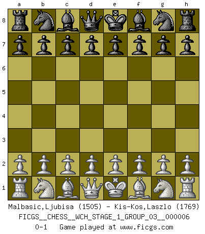 Last move : 0-1 2009 March 5 22:16:36 [Event "FICGS__CHESS__WCH_STAGE_1_GROUP_03__000006"] [Site "FICGS"] [Date "2009.02.03"] [Round "1"] [White "Malbasic,Ljubisa"] [Black "Kis-Kos,Laszlo"] [Result "0-1"] [WhiteElo "1505"] [BlackElo "1769"] 0-1 This chess game has been lost on time (started : 2009.02.03 12:36:31) Player Black won this chess game. Follow this game move after move (download)A chess genius has died; a loss for humanity. (Viktor Kortchnoi, about Bobby Fischer's death) Ich war zu klein für die Schach-Schülermannschaft! (Woody Allen) Debemos de asegurarnos de que el Ajedrez no se convierta en un lenguaje muerto, muy interesante, pero solo para un grupo muy pequeño. (Sytze Faber) Les échecs sont utiles à l'exercice de la faculté de penser et à celle de l'imagination. Car nous devons posséder une méthode élaborée pour atteindre des buts partout où nous devons conduire notre raison. (Leibnitz) Gambling : The sure way of getting nothing from something. (Wilson Mizner)
