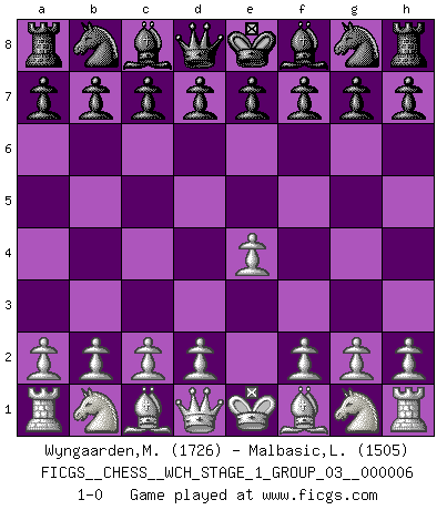 Last move : 1-0 2009 March 5 22:16:36 [Event "FICGS__CHESS__WCH_STAGE_1_GROUP_03__000006"] [Site "FICGS"] [Date "2009.02.03"] [Round "1"] [White "Wyngaarden,Martin"] [Black "Malbasic,Ljubisa"] [Result "1-0"] [WhiteElo "1726"] [BlackElo "1505"] 1.e4 1-0 This chess game has been lost on time (started : 2009.02.03 12:36:31) King's pawn Opening Player White won this chess game. Follow this game move after move (download)Alekhine is a poet who creates a work of art out of something that would hardly inspire another man to send home a picture post card. (Max Euwe) Ich glaube, ich kenne inzwischen die Gründe für mein Versagen: schachliche Charakterfehler. Ich war nie ein Wunderkind und in meiner gesamten menschlichen Entwicklung immer zu langsam. (Viktor Kortschnoi) Fischer es una tragedia del Ajedrez Americano a la par con Morphy y Pillsbury. (Mig Greengard) Dieu déplace le joueur, et celui-ci la pièce. Quel Dieu derrière Dieu commence donc la trame ? Arturo Perez-Reverte (prix de littérature policière 1993). Life doesn't imitate art, it imitates bad television. (Woody Allen)