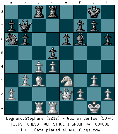 Last move : 1-0 2009 April 18 15:13:16 [Event "FICGS__CHESS__WCH_STAGE_1_GROUP_04__000006"] [Site "FICGS"] [Date "2009.02.03"] [Round "1"] [White "Legrand,Stephane"] [Black "Guzman,Carlos"] [Result "1-0"] [WhiteElo "2212"] [BlackElo "2074"] 1.d4 e6 2.Nf3 Nf6 3.g3 b6 4.Bg2 Bb7 5.O-O Be7 6.c4 O-O 7.Nc3 Ne4 8.Qc2 Nxc3 9.Qxc3 c5 10.Rd1 d6 11.b3 Bf6 12.Bb2 Qe7 13.Qc2 Nc6 14.e3 Rfd8 15.Qe2 Rac8 16.Rac1 h6 17.Ne1 cxd4 18.exd4 Nb4 19.Bxb7 Qxb7 20.Bc3 Na6 21.Ng2 d5 22.Ne3 1-0 This chess game has been lost on time (started : 2009.02.03 12:38:13) Queen's pawn Kingside Castling by player White (move 5) Kingside Castling by player Black (move 6) Player White won this chess game. Follow this game move after move (download)It is not enough to be a good player... you must also play well. (Siegbert Tarrasch) Es ist schade, dass viele Schachsportler vergessen, wie wichtig Auftreten und angemessene Kleidung sind. (Alexandra Kosteniuk) El Ajedrez es tan inspirador que yo no creo que un buen jugador sea capaz de tener un pensamiento malo durante una partida. (Wilhelm Steinitz) Le temps de noter son nom sur la feuille de partie, j'étais déjà en zeitnot ! D'un modeste amateur apparié lors de la première ronde d'un open contre le grand-maître Azmaïparashvili. Don't anthropomorphize computers - they hate it. (Anonymous)