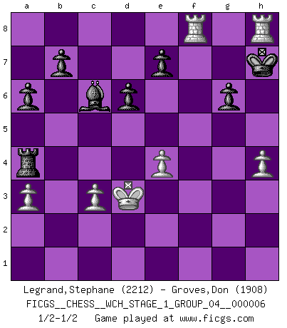 Last move : 1/2-1/2 2009 July 5 4:30:43 [Event "FICGS__CHESS__WCH_STAGE_1_GROUP_04__000006"] [Site "FICGS"] [Date "2009.02.03"] [Round "1"] [White "Legrand,Stephane"] [Black "Groves,Don"] [Result "1/2-1/2"] [WhiteElo "2212"] [BlackElo "1908"] 1.e4 c5 2.Nf3 d6 3.d4 cxd4 4.Nxd4 Nf6 5.Nc3 g6 6.Be3 Bg7 7.f3 O-O 8.Qd2 Nc6 9.O-O-O Nxd4 10.Bxd4 Be6 11.Kb1 Rc8 12.g4 Nd7 13.Bxg7 Kxg7 14.h4 Qa5 15.g5 Ne5 16.f4 Rxc3 17.Qxc3 Qxa2+ 18.Kc1 Rc8 19.Qa3 Qxa3 20.bxa3 Ng4 21.Re1 Bb3 22.Kb2 Ba4 23.Bd3 h5 24.gxh6+ Kxh6 25.Rhg1 Bd7 26.Rg2 Rc5 27.Reg1 Kh5 28.f5 Ne5 29.fxg6 fxg6 30.Rf2 Kh6 31.Rf8 Kg7 32.Rgf1 a6 33.R1f2 Rc6 34.Rd8 Rb6+ 35.Ka2 Rc6 36.Rg2 Bh3 37.Rg3 Bg4 38.Kb2 Rb6+ 39.Kc1 Rc6 40.Kd2 Bh5 41.Rb8 Rc7 42.Kc1 Nd7 43.Ra8 Ne5 44.Re3 Ng4 45.Re1 Ne5 46.Kb2 Bg4 47.Rg1 Bf3 48.Kb3 Nd7 49.Re1 Ne5 50.Rg1 Nd7 51.Kb2 Ne5 52.Rg3 Bd1 53.Rg2 Bf3 54.Rf2 Rc6 55.Rb8 Rc7 56.Rf1 Nc6 57.Re8 Ne5 58.Rf2 Kf7 59.Rd8 Kg7 60.Rb8 Nd7 61.Ra8 Ne5 62.Ka2 Bd1 63.Rd2 Bf3 64.Rh2 Rc3 65.Kb2 Rc6 66.Rh3 Rc7 67.Rg3 Bd1 68.c3 Bf3 69.Kc2 Bg4 70.Rg2 Bd7 71.Rf2 Rc5 72.R2f8 Ra5 73.Rg8+ Kh7 74.Rgb8 Ba4+ 75.Kd2 Bc6 76.Rh8+ Kg7 77.Raf8 Nxd3 78.Rhg8+ Kh7 79.Kxd3 Ra4 80.Rh8+ Kg7 81.Rhg8+ Kh7 82.Rh8+ 1/2-1/2 Sicilian : Dragon, Yugoslav attack, 7...O-O Kingside Castling by player Black (move 7) Queenside Castling by player White (move 9) This chess game ended in a draw. Follow this game move after move (download)Examine moves that smite! A good eye for smites is far more important than a knowledge of strategical principles. (Purdy) Ich bin es gewohnt, das die Jugend mir überhaupt keinen Respekt entgegenbringt. (Alexander Morozewich) El tablero es el mundo, las piezas es el fenomeno del universo, las reglas del juego son lo que llamamos leyes de la naturaleza y el jugador del lado opuesto, se encuentra oculto a nuestra vista. (Thomas Huxley) J'ai toujours senti une vague pitié pour l'homme qui ne connaît rien aux échecs, tout comme j'en aurais pour un homme ignorant de l'amour. Les Echecs, comme la musique ou comme l'amour, ont le pouvoir de rendre heureux. (Siegbert Tarrasch) Life is like a play: it's not the length but the excellence of the acting that matters. (Seneca)