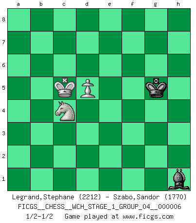 Last move : 1/2-1/2 2009 July 12 19:18:44 [Event "FICGS__CHESS__WCH_STAGE_1_GROUP_04__000006"] [Site "FICGS"] [Date "2009.02.03"] [Round "1"] [White "Legrand,Stephane"] [Black "Szabo,Sandor"] [Result "1/2-1/2"] [WhiteElo "2212"] [BlackElo "1770"] 1.d4 d5 2.c4 e6 3.Nc3 Nf6 4.cxd5 exd5 5.Bg5 Be7 6.e3 O-O 7.Bd3 Nbd7 8.Nf3 c6 9.Qc2 h6 10.Bh4 Re8 11.Bg3 c5 12.dxc5 Nxc5 13.O-O a6 14.Nd4 Bg4 15.f3 Nxd3 16.Qxd3 Bd7 17.Bh4 g5 18.Bf2 Rc8 19.Rac1 Qb6 20.Rc2 Bb4 21.a3 Bc5 22.Nce2 Ba4 23.b3 Bd7 24.b4 Bf8 25.Rfc1 Rxc2 26.Rxc2 a5 27.b5 Qd6 28.Rc3 Rc8 29.Rxc8 Bxc8 30.Qc3 Bd7 31.a4 Qb4 32.Qxb4 Bxb4 33.Nc1 Kf8 34.Kf1 Bd6 35.h3 Bc8 36.Be1 b6 37.Ke2 h5 38.h4 g4 39.Kd2 Nd7 40.Nd3 gxf3 41.gxf3 Ne5 42.Nxe5 Bxe5 43.Ne2 Be6 44.Bg3 f6 45.Bxe5 fxe5 46.f4 d4 47.exd4 exf4 48.Nxf4 Bb3 49.Nxh5 Bxa4 50.Nf4 Kf7 51.Nd5 Bxb5 52.Nxb6 Kg6 53.Kc3 Bc6 54.Nc4 Kh5 55.Nxa5 Bg2 56.Kb4 Kxh4 57.Kc5 Kg5 58.Nc4 Bh1 59.d5 1/2-1/2 QGD : Exchange, positional line Kingside Castling by player Black (move 6) Kingside Castling by player White (move 13) 10 pieces endgame at move 49 : White KNPPPP , Black KBPP WHITE : King + 1 Knight 4 Pawns BLACK : King + 1 Bishop 2 Pawns 9 pieces endgame at move 49 : White KNPPP , Black KBPP WHITE : King + 1 Knight 3 Pawns BLACK : King + 1 Bishop 2 Pawns 8 pieces endgame at move 51 : White KNPP , Black KBPP WHITE : King + 1 Knight 2 Pawns BLACK : King + 1 Bishop 2 Pawns 7 pieces endgame at move 52 : White KNPP , Black KBP WHITE : King + 1 Knight 2 Pawns BLACK : King + 1 Bishop 1 Pawn 6 pieces endgame at move 55 : White KNPP , Black KB WHITE : King + 1 Knight 2 Pawns BLACK : King + 1 Bishop 5 pieces endgame at move 56 : White KNP , Black KB WHITE : King + 1 Knight 1 Pawn BLACK : King + 1 Bishop This chess game ended in a draw. Follow this game move after move (download)You need not play well - just help your opponent to play badly. (Genrikh Chepukaitis) Ich verstehe den Grund nicht, warum die Aufteilung in Frauen und Männer überhaupt im Schach besteht. (Judith Polgar) A través de las casillas del tablero, los Indios explican el movimiento del tiempo y la edad, las influencias mas altas que controlan el mundo y los lazos que vinculan al Ajedrez con el alma humana. (Al-Masudi) Les sacrifices démontrent seulement que quelqu'un a gaffé. (Savielly Tartacover) The real voyage of discovery consists not in seeking new lands but in seeing with new eyes. (Marcel Proust)