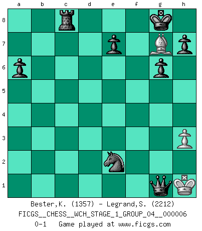 Last move : 0-1 2009 March 10 7:56:21 [Event "FICGS__CHESS__WCH_STAGE_1_GROUP_04__000006"] [Site "FICGS"] [Date "2009.02.03"] [Round "1"] [White "Bester,Kazimierz"] [Black "Legrand,Stephane"] [Result "0-1"] [WhiteElo "1357"] [BlackElo "2212"] 1.e4 c5 2.Nf3 d6 3.d4 cxd4 4.Nxd4 Nf6 5.Nc3 Nc6 6.Nf3 g6 7.Bb5 Bd7 8.O-O Bg7 9.Bf4 O-O 10.a4 a6 11.Bd3 Bg4 12.h3 Bxf3 13.Qxf3 Nd7 14.Ne2 Bxb2 15.Rab1 Bg7 16.Rxb7 Nc5 17.Bc4 Nxb7 18.Bd5 Rc8 19.c3 Qd7 20.Qd3 Nc5 21.Qf3 Ne5 22.Nd4 Nxf3+ 23.Nxf3 Nxa4 24.Rb1 Nxc3 25.Rb7 Qa4 26.Bb3 Qxe4 27.Bxf7+ Rxf7 28.Bxd6 Qxb7 29.Be5 Rxf3 30.gxf3 Qxf3 31.Bxg7 Ne2+ 32.Kh2 Qxf2+ 33.Kh1 Qg1+ 0-1 Sicilian Kingside Castling by player White (move 8) Kingside Castling by player Black (move 9) Player Black won this chess game. Follow this game move after move (download)Chess is life. (Bobby Fischer) Immer nach dem besten Zug zu suchen ist ziemlich unpraktisch. (Nigel Short) La mitad de las variaciones que son calculadas en una partida de torneo, resultan ser completamente superfluas. Desafortunadamente, nadie sabe por adelantado cual mitad. (Jan Tinman) Si rien de grave n'est détecté lors de l'analyse d'une position, on joue alors le coup. Seconde règle de Blumenfeld. There's always a bigger fish. (Qui-Gon Jinn in Star Wars ep.1)