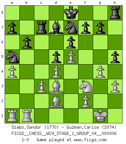 Last move : 1-0 2009 April 25 16:5:50 [Event "FICGS__CHESS__WCH_STAGE_1_GROUP_04__000006"] [Site "FICGS"] [Date "2009.02.03"] [Round "1"] [White "Szabo,Sandor"] [Black "Guzman,Carlos"] [Result "1-0"] [WhiteElo "1770"] [BlackElo "2074"] 1.e4 e6 2.d4 d5 3.Nc3 Bb4 4.e5 c5 5.a3 Bxc3+ 6.bxc3 Ne7 7.Nf3 Bd7 8.a4 Qa5 9.Qd2 Nbc6 10.Be2 Rc8 11.O-O cxd4 12.cxd4 Qxd2 13.Bxd2 Nf5 14.c3 Na5 15.g4 Ne7 16.Rfb1 b6 17.h3 h5 18.Ba6 Rc7 19.Bd3 1-0 This chess game has been lost on time (started : 2009.02.03 12:38:13) French : Winawer, Advance, positional Main line Kingside Castling by player White (move 11) Player White won this chess game. Follow this game move after move (download)The passion for playing Chess is one of the most unaccountable in the world. (H.G. Wells) Vielleicht wirkt die Aura früherer Spieler glanzvoller als die der heutigen Spieler, aber das liegt daran, dass man kein Programm wie Fritz hatte, das einem all die Löcher in ihren Partien zeigt. (Vladimir Kramnik) Uno por uno, yo los acribillé, mi superioridad muy pronto se volvio aparente. (Jose Capablanca) Plusieurs personnes se sont demandées comment Tal faisait pour gagner... En fait, c'est très simple ! Il met ses pièces au centre de l'échiquier et les sacrifie quelque part ! (David Bronstein) To err is human, but to really foul things up requires a computer. (Farmer's Almanac, 1978)