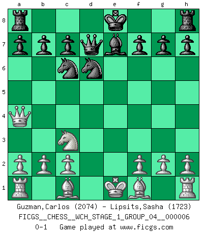 Last move : 0-1 2009 March 26 12:1:53 [Event "FICGS__CHESS__WCH_STAGE_1_GROUP_04__000006"] [Site "FICGS"] [Date "2009.02.03"] [Round "1"] [White "Guzman,Carlos"] [Black "Lipsits,Sasha"] [Result "0-1"] [WhiteElo "2074"] [BlackElo "1723"] 1.e4 e5 2.Nf3 Nf6 3.d4 exd4 4.e5 Ne4 5.Qxd4 d5 6.exd6 Nxd6 7.Nc3 Nc6 8.Qa4 Be7 9.Ne5 Bd7 10.Nxd7 Qxd7 0-1 This chess game has been lost on time (started : 2009.02.03 12:38:13) Petrov : Modern attack, Main line Player Black won this chess game. Follow this game move after move (download)A man that will take back a move at Chess will pick a pocket. (Richard Fenton) Computer sind die einzigen Gegner, die nicht immer eine Ausrede auf Lager haben, wenn sie gegen mich verlieren. (Robert James Fischer) El Ajedrez es imaginación. (David Bronstein) Que feriez-vous si vous étiez en train de jouer aux échecs et que la fin du monde arrive ? Je continuerais à jouer. (Saint Borromée) History is the quarrels of popes and kings, with wars or pestilences in every page; the men all so good for nothing, and hardly any women at all. (Jane Austen)