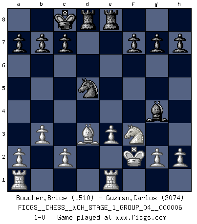 Last move : 1-0 2009 April 28 4:19:43 [Event "FICGS__CHESS__WCH_STAGE_1_GROUP_04__000006"] [Site "FICGS"] [Date "2009.02.03"] [Round "1"] [White "Boucher,Brice"] [Black "Guzman,Carlos"] [Result "1-0"] [WhiteElo "1510"] [BlackElo "2074"] 1.f4 e5 2.fxe5 d6 3.Nf3 dxe5 4.Nxe5 Bd6 5.d4 Bxe5 6.dxe5 Qxd1+ 7.Kxd1 Nc6 8.Bf4 Nge7 9.e3 Be6 10.Bd3 Ng6 11.Ke2 Ngxe5 12.Bxe5 Nxe5 13.Nd2 O-O-O 14.Nf3 Nc4 15.b3 Nb6 16.Nd4 Bg4+ 17.Nf3 Nd5 18.Kf2 Rhe8 19.Rhe1 1-0 This chess game has been lost on time (started : 2009.02.03 12:38:13) Bird : From gambit Queenside Castling by player Black (move 13) Player White won this chess game. Follow this game move after move (download)We must make sure that Chess will not be like a dead language, very interesting, but for a very small group. (Sytze Faber) Eine Person mit durchschnittlichem IQ kann etwa eine ELO von 2000 erreichen. (Jonathan Levitt) No es suficiente ser un buen jugador, se debe también de jugar bién. (Siegbert Tarrasch) Il n'y a pas eu de défaite parce que je ne crois pas que cet ordinateur ait jamais existé. IBM a triché en refusant d'imprimer les modes de recherche de la machine. C'est évident, pendant le match, des coups décisifs ont été joués par des êtres humains. Aujourd'hui, les meilleurs spécialistes en informatique ne peuvent toujours pas expliquer comment Deep-Blue a pu jouer contre la logique des ordinateurs. IBM a gagné une guerre de communication, mais ils sont incapables de prouver que l'ordinateur a gagné tout seul. (Garry Kasparov) I couldn't make any sense out of what this particular thread is about. It sounds like R2 D2 computer speaking. A space fight ?!? Some 'command' problems in Moscow ? Some killers & narcotic addicts attacking some game & a god wannabe ?? (Dinesh De Silva, lost in a russian conflict in FICGS forum)