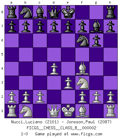 Last move : 1-0 2006 June 2 9:15:15 [Event "FICGS__CHESS__CLASS_B__000002"] [Site "FICGS"] [Date "2006.04.16"] [Round "1"] [White "Nucci,Luciano"] [Black "Jonsson,Paul"] [Result "1-0"] [WhiteElo "2101"] [BlackElo "2087"] 1.d4 Nf6 2.Nf3 g6 3.Bf4 Bg7 4.e3 1-0 This chess game has been lost on time (started : 2006.04.16 20:10:47) King's Indian : London system Player White won this chess game. Follow this game move after move (download)Openings teach you openings. Endgames teach you chess ! (Stephan Gerzadowicz) Kombinieren und Schwarzhandel gehören verboten. (Savielly Grigorievitsch Tartakower) La estratégia requiere pensar, la táctica requiere observación. (Max Euwe) Karpov est une pièce de musée. (Garry Kasparov) Luck is what you have left over after you give 100 percent. (Langston Coleman)