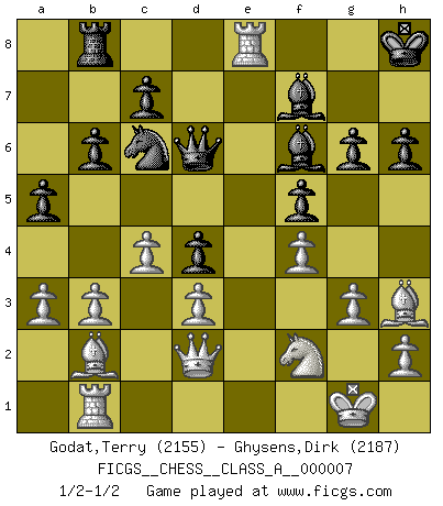 Last move : 1/2-1/2 2006 October 10 2:40:38 [Event "FICGS__CHESS__CLASS_A__000007"] [Site "FICGS"] [Date "2006.08.27"] [Round "1"] [White "Godat,Terry"] [Black "Ghysens,Dirk"] [Result "1/2-1/2"] [WhiteElo "2155"] [BlackElo "2187"] 1.Nf3 Nf6 2.g3 d5 3.Bg2 e6 4.c4 Be7 5.b3 O-O 6.O-O Nc6 7.Bb2 d4 8.e3 e5 9.exd4 exd4 10.d3 Bf5 11.a3 a5 12.Re1 Qd7 13.Qc2 Rfe8 14.Nbd2 Bc5 15.Ng5 Ne5 16.Nge4 Nxe4 17.Nxe4 Be7 18.f3 Bg6 19.Nf2 Nc6 20.f4 f5 21.Qd2 Rab8 22.Nh3 h6 23.Nf2 Bf7 24.Bf3 Bf6 25.Rab1 Kh8 26.Bg2 b6 27.Bh3 g6 28.Re4 Qd6 29.Rxe8+ 1/2-1/2 Reti Opening Kingside Castling by player Black (move 5) Kingside Castling by player White (move 6) This chess game ended in a draw. Follow this game move after move (download)Chess holds its master in its own bonds, shackling the mind and brain so that the inner freedom of the very strongest must suffer. (Albert Einstein) Ein Isolani verdüstert die Stimmung auf dem ganzen Schachbrett. (Savielly Grigorievitsch Tartakower) El Ajedrez es 99 por ciento táctica. (Teichmann) Le jeu d'échecs est comme rejeté hors du temps. (Antoine de Saint-Exupéry) Now the reason the enlightened prince and the wise general conquer the enemy whenever they move and their achievements surpass those of ordinary men is foreknowledge. (Sun Tzu)