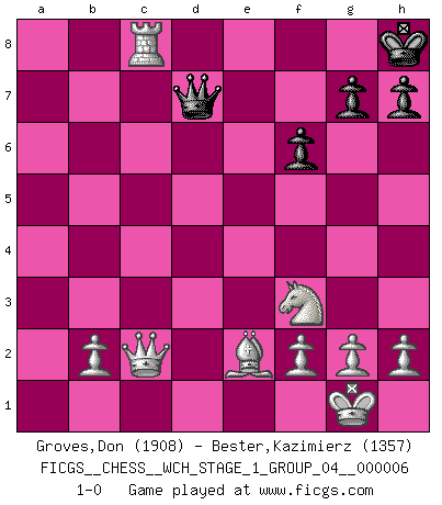 Last move : 1-0 2009 March 10 8:57:48 [Event "FICGS__CHESS__WCH_STAGE_1_GROUP_04__000006"] [Site "FICGS"] [Date "2009.02.03"] [Round "1"] [White "Groves,Don"] [Black "Bester,Kazimierz"] [Result "1-0"] [WhiteElo "1908"] [BlackElo "1357"] 1.e4 e6 2.d4 d6 3.Nf3 Be7 4.Bd3 a6 5.O-O Nf6 6.e5 Nd5 7.c4 Nb4 8.exd6 Bxd6 9.Be2 O-O 10.Nc3 b6 11.Bg5 f6 12.Be3 Bb7 13.Qb3 Kh8 14.c5 bxc5 15.dxc5 N8c6 16.cxd6 Qxd6 17.Rfd1 Qe7 18.a3 a5 19.axb4 Nxb4 20.Qc4 Nc2 21.Bc5 Bd5 22.Nxd5 Qf7 23.Qxc2 exd5 24.Bxf8 Rxf8 25.Rxa5 Rd8 26.R1xd5 Rc8 27.Rdc5 Qd7 28.Rxc7 Rxc7 29.Ra8+ Rc8 30.Rxc8+ 1-0 Lengfellner system Kingside Castling by player White (move 5) Kingside Castling by player Black (move 9) Player White won this chess game. Follow this game move after move (download)It is always better to sacrifice your opponent's men. (Savielly Tartakower) Ich habe die besten Aussichten, den ersten Preis zu gewinnen - denn jeder muss gegen Steinitz spielen, nur ich nicht! (Wilhelm Steinitz) Haz el enroque temprano y seguido. (Rob Sillars) Votre prénom est 'Tactique', votre deuxième prénom est 'Tactique' et votre nom est 'Tactique'. (Ken Smith) The Internet is the first thing that humanity has build that humanity doesn't understand, the largest experiment in anarchy that we have ever had. (Eric Schmidt)