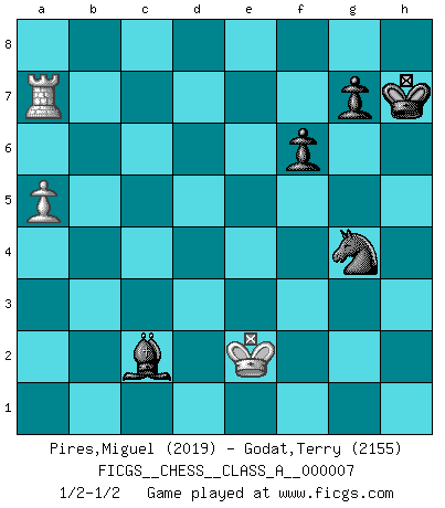 Last move : 1/2-1/2 2007 January 25 23:53:25 [Event "FICGS__CHESS__CLASS_A__000007"] [Site "FICGS"] [Date "2006.08.27"] [Round "1"] [White "Pires,Miguel"] [Black "Godat,Terry"] [Result "1/2-1/2"] [WhiteElo "2019"] [BlackElo "2155"] 1.e4 e5 2.Bb5 c6 3.Ba4 Nf6 4.Qe2 Bc5 5.Nf3 d5 6.exd5 O-O 7.dxc6 bxc6 8.Nc3 e4 9.Ne5 Qc7 10.Nc4 Bg4 11.f3 exf3 12.gxf3 Re8 13.Ne3 Bh3 14.Qf2 Nbd7 15.Qg3 Qxg3+ 16.hxg3 Bg2 17.Rh4 Bxe3 18.dxe3 Bxf3 19.Rd4 Rab8 20.b4 Ne5 21.Kf1 Rbd8 22.Bb3 Rc8 23.a4 h6 24.Bd2 h5 25.e4 c5 26.bxc5 Rxc5 27.Nd5 Nxe4 28.Bb4 Rxd5 29.Bxd5 Nxg3+ 30.Kf2 Ne2 31.Rd2 Bxd5 32.Rxe2 Ng4+ 33.Ke1 Rxe2+ 34.Kxe2 h4 35.Rd1 Be4 36.Rd8+ Kh7 37.Rd7 h3 38.Bd6 f6 39.Bg3 Bxc2 40.Rxa7 h2 41.Bxh2 Nxh2 42.a5 Ng4 1/2-1/2 King's pawn game Kingside Castling by player Black (move 6) 10 pieces endgame at move 40 : White KRBP , Black KBNPPP WHITE : King + 1 Rook 1 Bishop 1 Pawn BLACK : King + 1 Bishop 1 Knight 3 Pawns 9 pieces endgame at move 41 : White KRBP , Black KBNPP WHITE : King + 1 Rook 1 Bishop 1 Pawn BLACK : King + 1 Bishop 1 Knight 2 Pawns 8 pieces endgame at move 41 : White KRP , Black KBNPP WHITE : King + 1 Rook 1 Pawn BLACK : King + 1 Bishop 1 Knight 2 Pawns This chess game ended in a draw. Follow this game move after move (download)One doesn't have to play well, it's enough to play better than your opponent. (Siegbert Tarrasch) Kostenjuk hat keinen Sexappeal. (Loek van Wely) Solo existe una cosa que Fischer hace en el Ajedrez sin placer: ¡perder!. (Boris Spassky) La conception d'un plan est le processus par lequel un joueur exploite les avantages de sa position tout en s'efforçant d'en réduire au minimum les inconvénients. Afin de garantir le succès, un plan doit toujours se fonder sur un diagnostic objectif des particularités d'une position. La conception d'un plan est d'autant plus difficile que la position est équilibrée, et grandement facilitée lorsqu'il n'existe qu'un seul plan susceptible de répondre aux exigences de la position. (Harry Golombek) Mandala - that's it! 16x16 squares as multiple of the four and the eight because of the Four Noble Truths and the Noble Eightfold Path. (Heinz-Georg Lehnhoff about Big Chess)